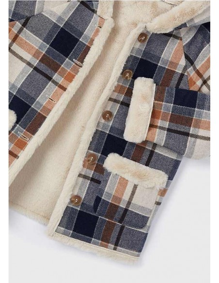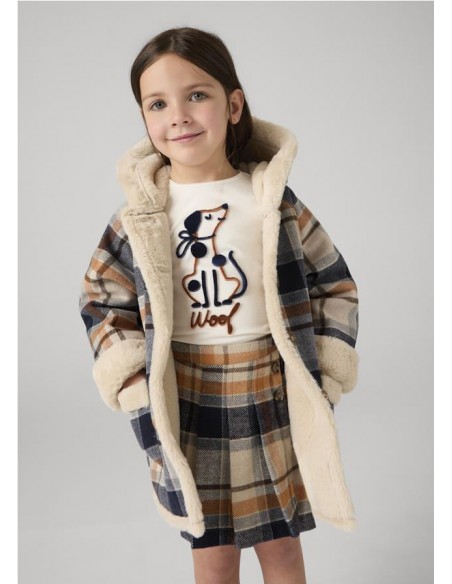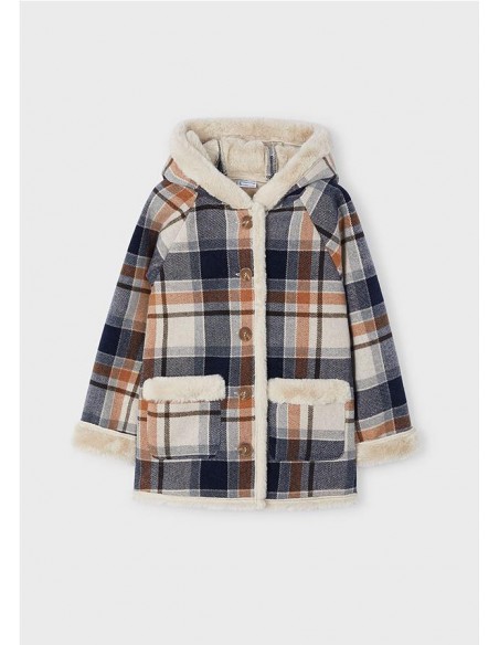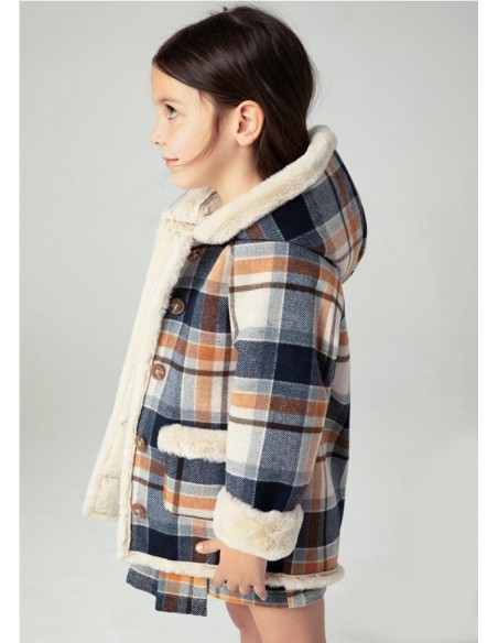 Abrigo de manga larga para niña. Modelo con capucha. Cierre con botones. Tejido doble faz con interior de pelo. Bolsillos funcionales en la parte delantera. Motivo de cuadros.
