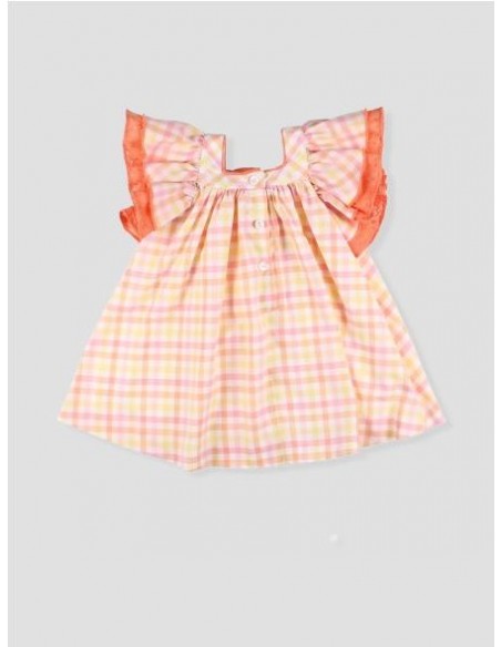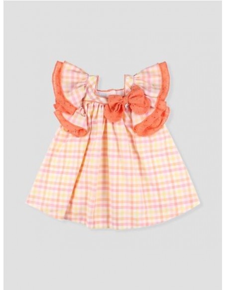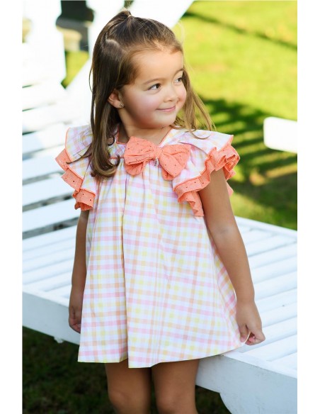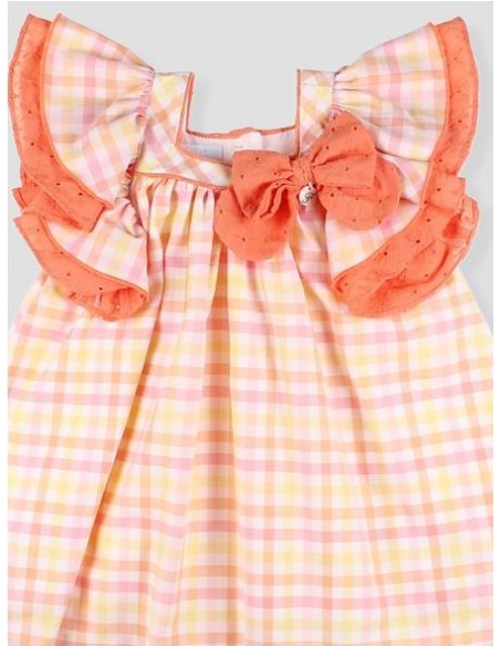 vestido de cuadros vichy en tonos pastel combina delicadeza y estilo. Los volantes con bordado en color coral destacan en los hombros, aportando volumen y gracia al diseño. Un lazo decorativo central eleva su encanto, mientras que el tejido suave y ligero asegura comodidad en cada movimiento. Perfecto para celebraciones o paseos veraniegos por su frescura y diseño alegre.