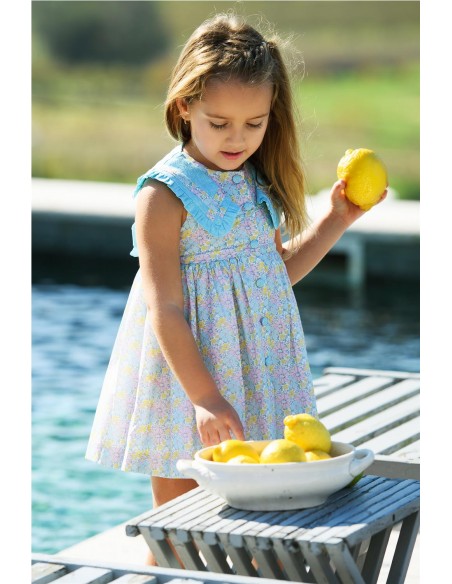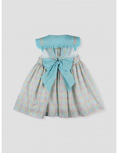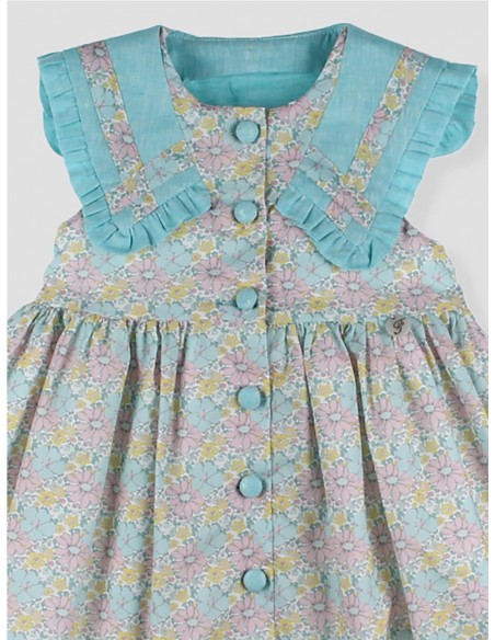 Precioso vestido de niña, combina un estampado floral en tonos pastel con delicados detalles azul turquesa en cuello y botones frontales, aportando elegancia y frescura. Su corte holgado y confección en tejidos ligeros de algodón y lino, garantizan máxima comodidad y libertad de movimiento. Destaca el lazo trasero ajustable que añade un toque especial.