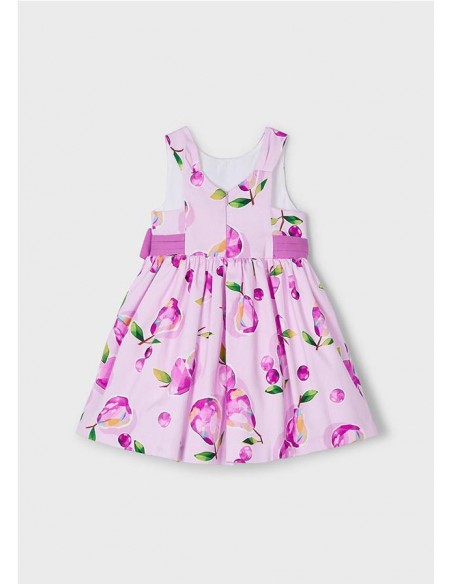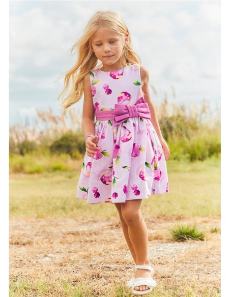 Vestido sin mangas para niña. Cuello redondo. Cierre con cremallera trasera invisible. Modelo con rizo. Elementos de adorno: lazo, fajín simulado a la cintura. Diseño estampado.