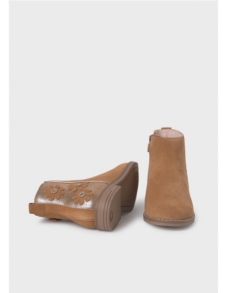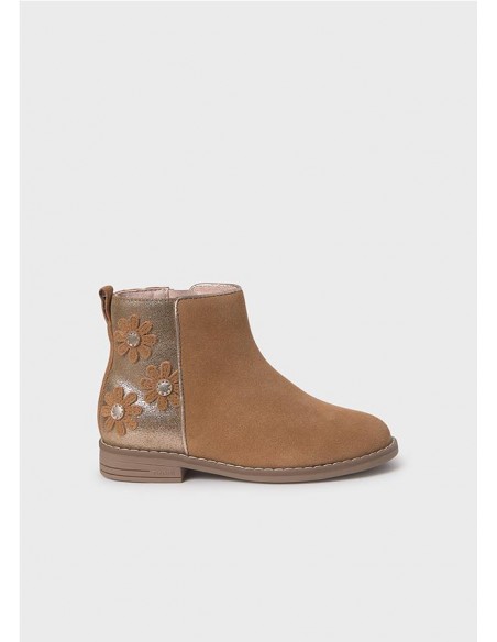 Botines infantiles para niña imprescindibles en cualquier armario de invierno. Un zapato práctico y abrigado para los días más fríos. Material exterior de piel serraje. Todos nuestros zapatos se realizan con pieles libres de cromo. Forro interior combinado de material textil y piel. Plantilla de piel. Suela de caucho ligera y flexible. Cierre con cremallera lateral para una puesta rápida y sencilla. Detalle metalizado. Aplique floral decorativo.