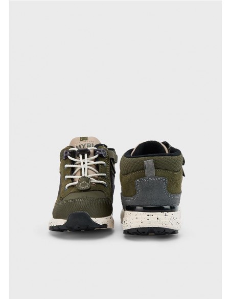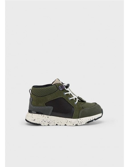 Botin outdoor ligero, fabricado en piel bovina y poliuretabo, con puntera reforzada en goma y ajuste en el empeine con una goma elástica, para mejor agarre y fácil puesta. Tallas 26 al 30.