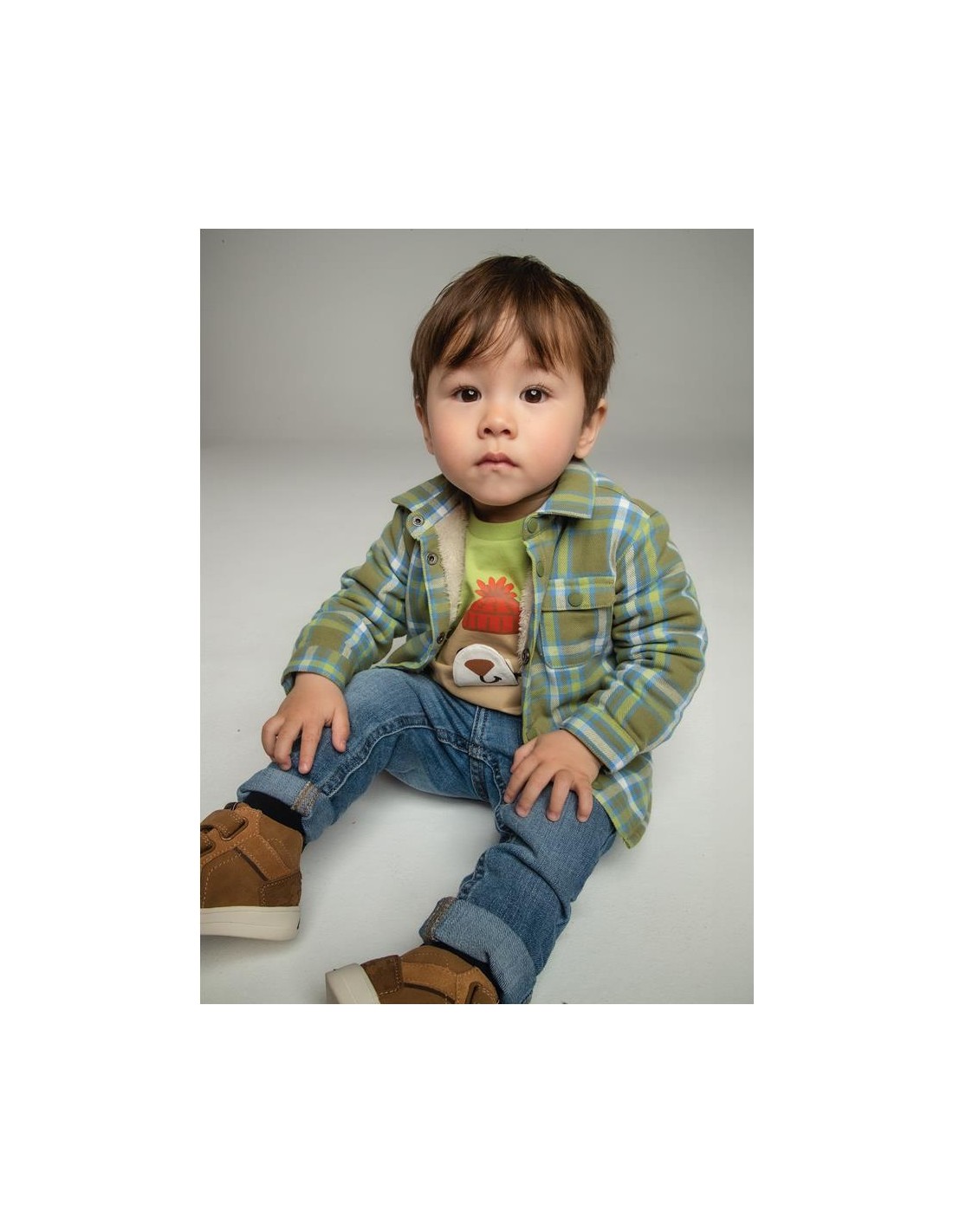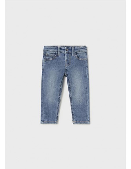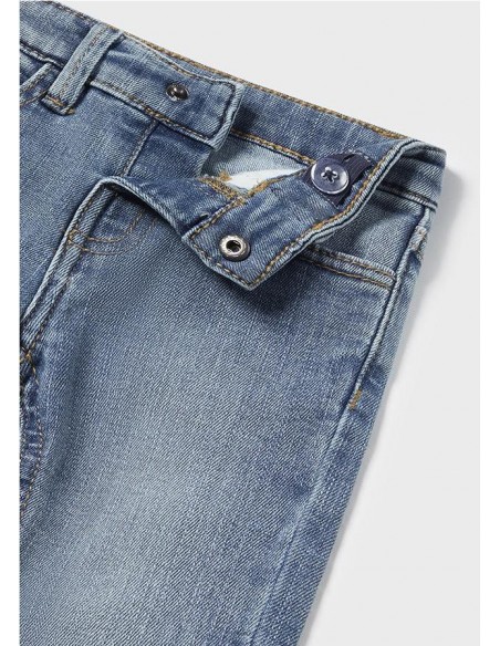 Pantalón largo para bebé de corte ajustado (Slim fit) que se adapta a la silueta. Goma elástica regulable con botones en el interior de la cinturilla para mayor ajuste. Cierre con botón a presión. Moderno tejido denim con efecto lavado y acabado desgastado. Contiene fornitura sostenible. Efecto lavado obtenido mediante procesos Ecowash de menor impacto ambiental.