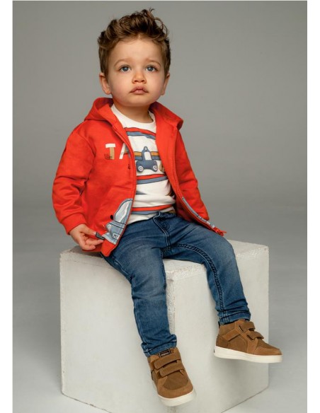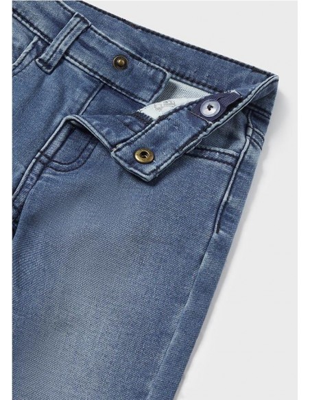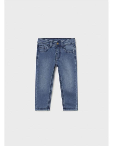 Pantalón largo para bebé de corte ajustado (Slim fit). Goma elástica regulable con botones en el interior de la cinturilla para mayor ajuste. Cierre con botón a presión. Cómodo y suave tejido vaquero de algodón elástico. Contiene fornitura sostenible. Diseño con múltiples bolsillos.