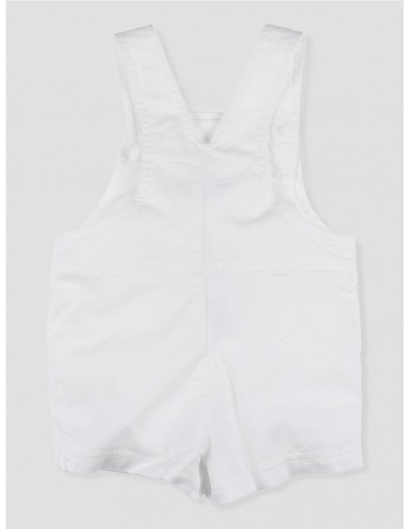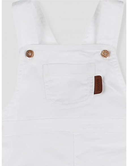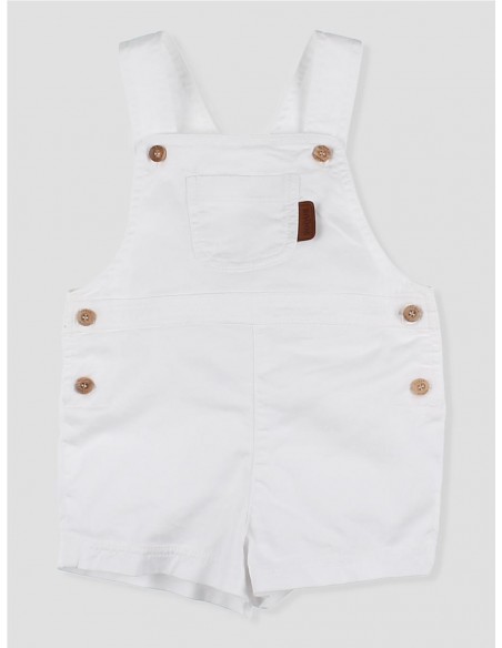 Este peto corto en color blanco para bebé niño, confeccionado en algodón suave, garantiza comodidad y libertad de movimiento en todo momento. Su diseño cuenta con tirantes ajustables, botones de madera y un original bolsillo delantero, aportando un toque funcional . Perfecto para combinar con camisas, camisetas o polos.