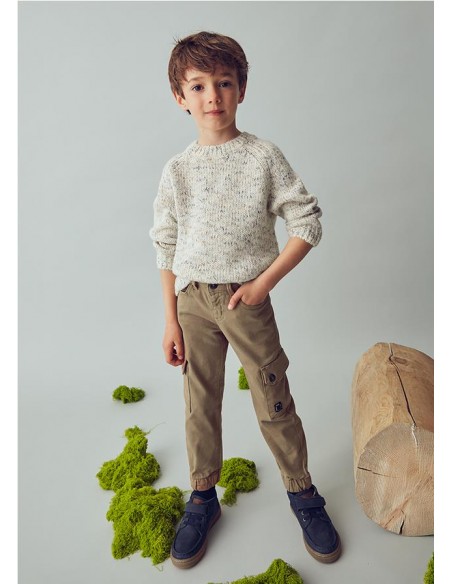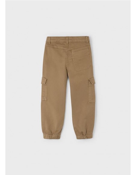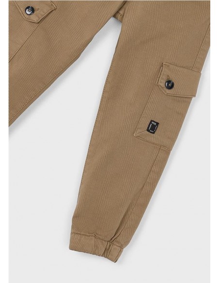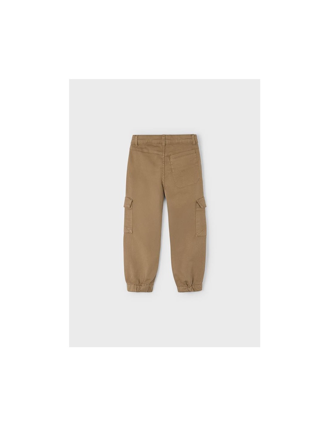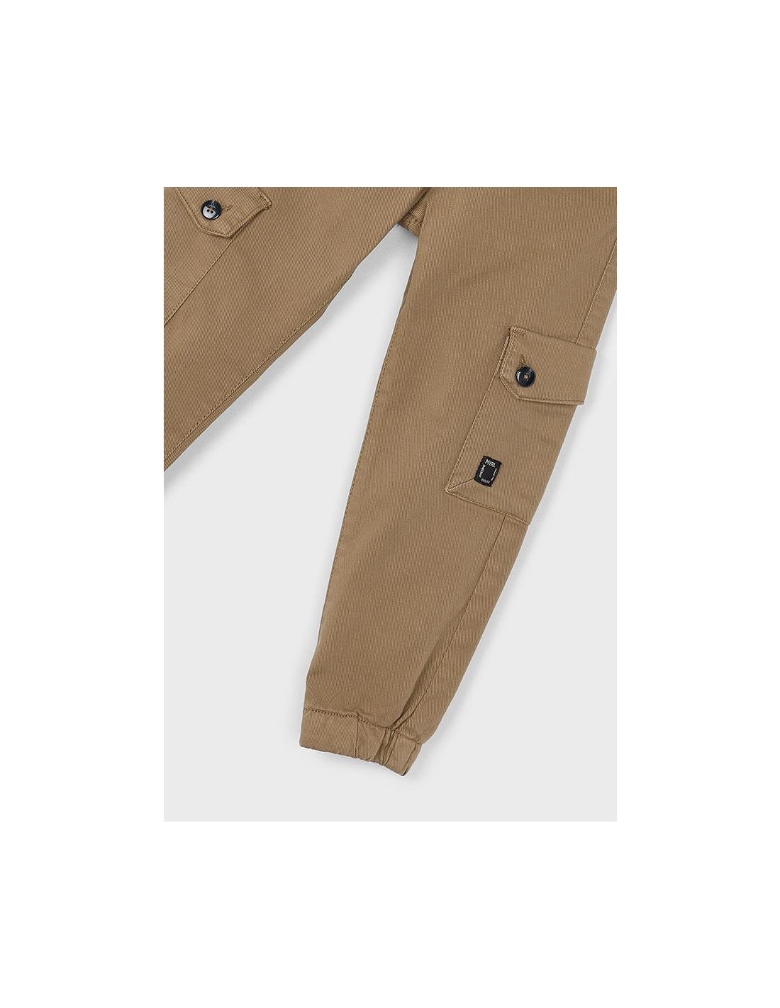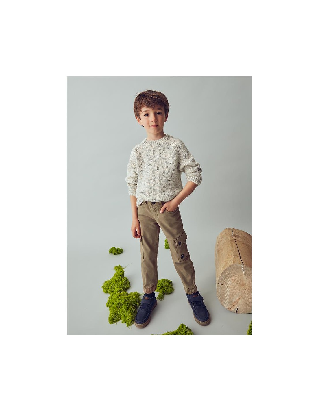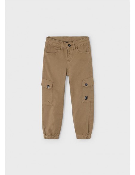 Pantalón largo para niño de estilo cargo, holgado en la parte superior, tiro caído y ajuste normal en la pernera. Cierre con un único botón. Goma elástica regulable con botones en el interior de la cinturilla para mayor ajuste. Bajo elástico para un mejor ajuste. Diseño con múltiples bolsillos. Por motivos de seguridad, las tallas pequeñas (2-5 años) no llevarán cremallera en la bragueta, sino que será simulada.