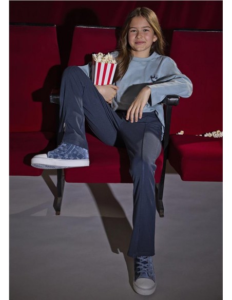 Pantalón para chica de estilo acampanado, ancho en el bajo. Cinturilla elástica. Tejido fluido para una máxima comodidad en el día a día. Elementos de adorno: aberturas de adorno.