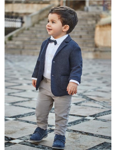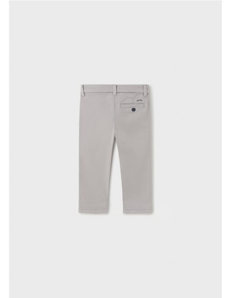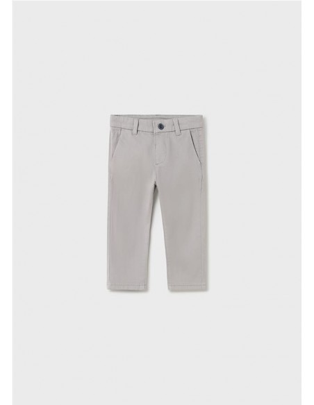 Pantalón largo para bebé de tipo chino y corte ajustado a la pierna para definir la silueta sin perder elegancia. Goma elástica regulable con botones en el interior de la cinturilla para mayor ajuste. Cómodo tejido de sarga de gran resistencia. Bolsillos funcionales en el delantero y en la parte trasera de la prenda.