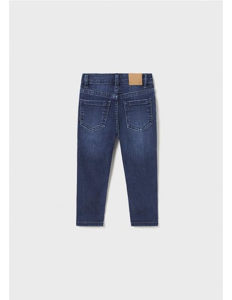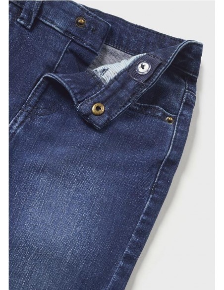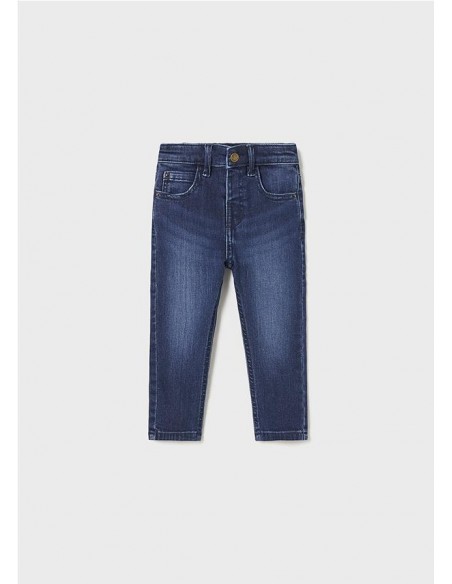 Pantalón largo para bebé de corte ajustado (Slim fit) que se adapta a la silueta. Goma elástica regulable con botones en el interior de la cinturilla para mayor ajuste. Cierre con botón a presión. Moderno tejido denim con efecto lavado y acabado desgastado. Contiene fornitura sostenible. Efecto lavado obtenido mediante procesos Ecowash de menor impacto ambiental.