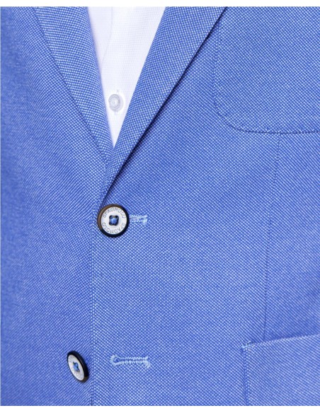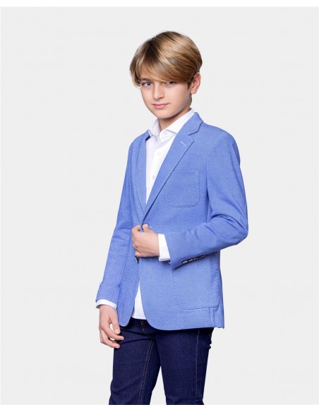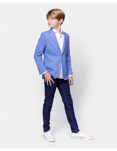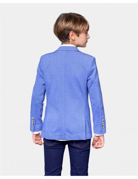 Americana de niño confeccionada en tejido de punto. Cuenta con cuello y solapa, cierre central mediante dos botones, pinza de entalle en el frontal y botones en los puños. Dos bolsillos de parche en el frontal y un bolsillo de parche en el pecho. Bolsillos y forro en el interior. Personalizada con pespuntes a contraste.