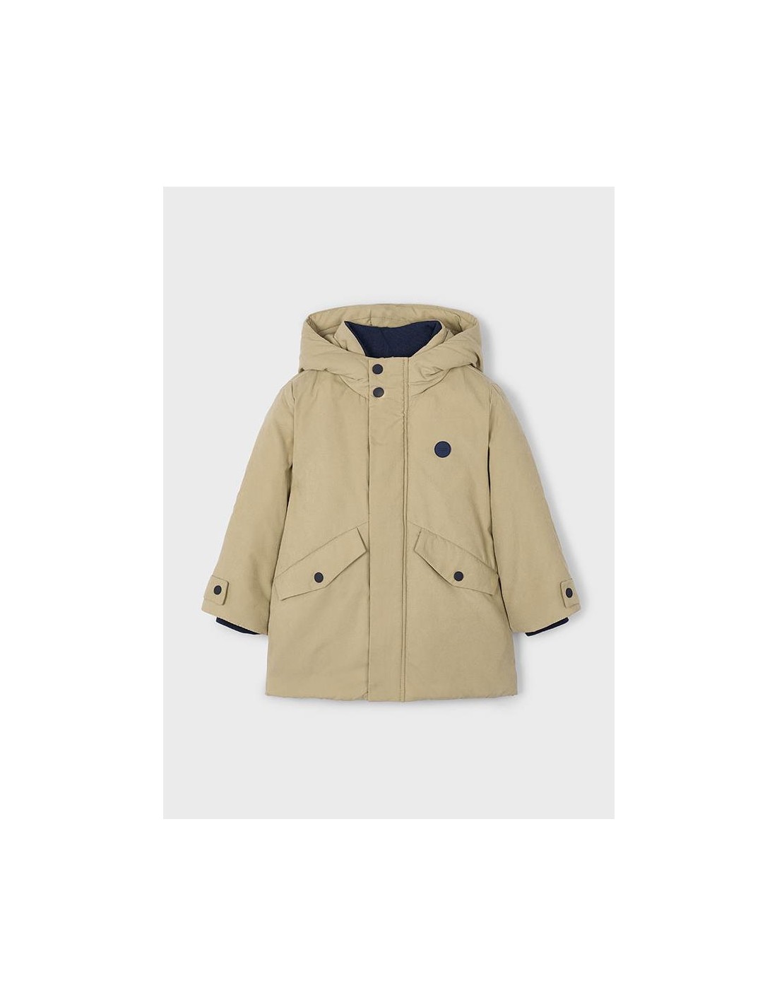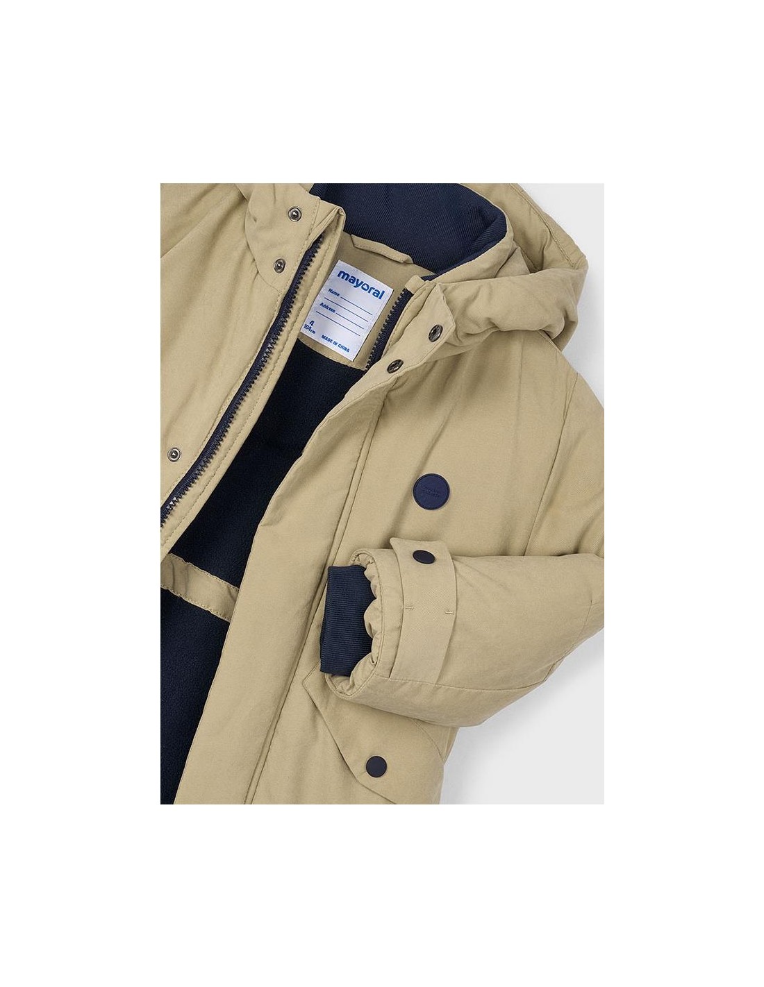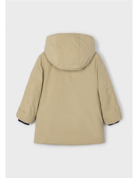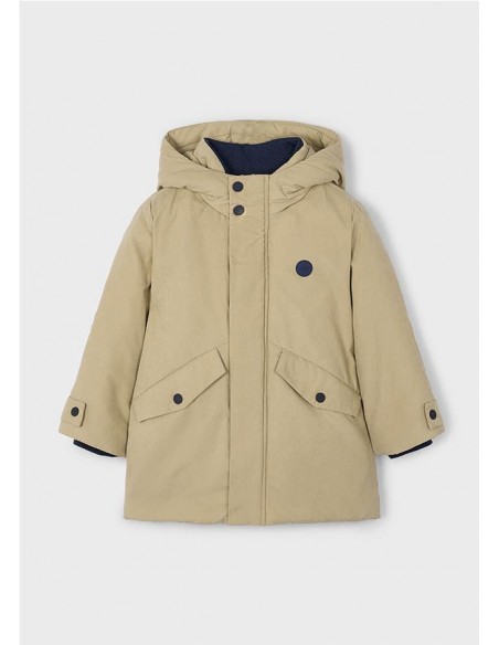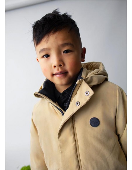 Chaquetón de manga larga para niño. Cuello con capucha. Cierre con cremallera y botones. Suave forro interior de poliéster. Bolsillos funcionales en la parte delantera.