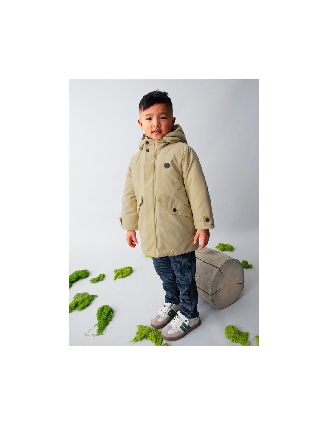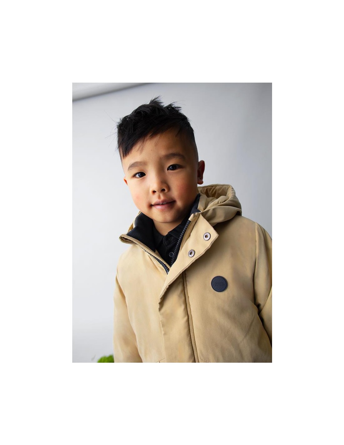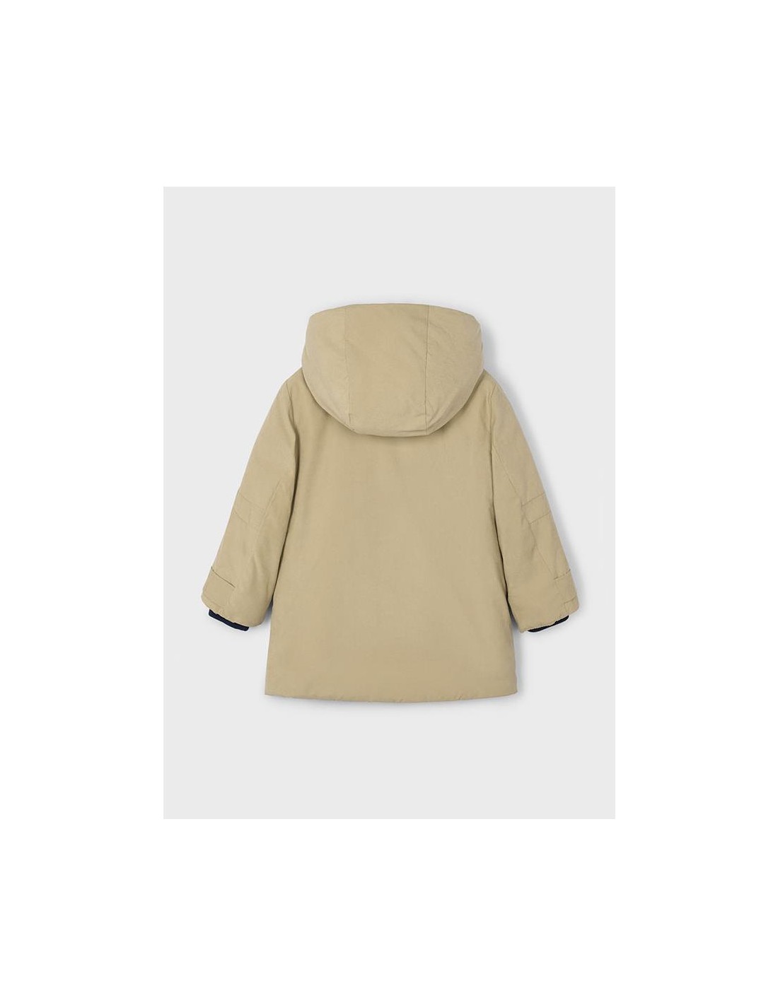 Chaquetón de manga larga para niño. Cuello con capucha. Cierre con cremallera y botones. Suave forro interior de poliéster. Bolsillos funcionales en la parte delantera.