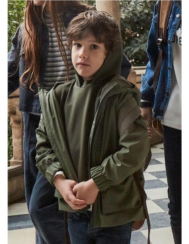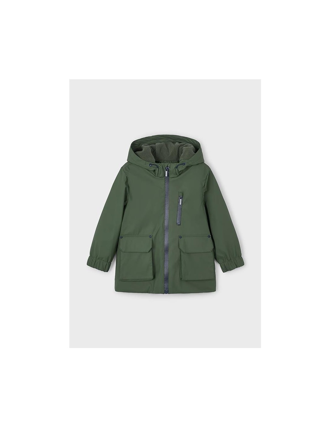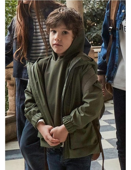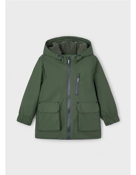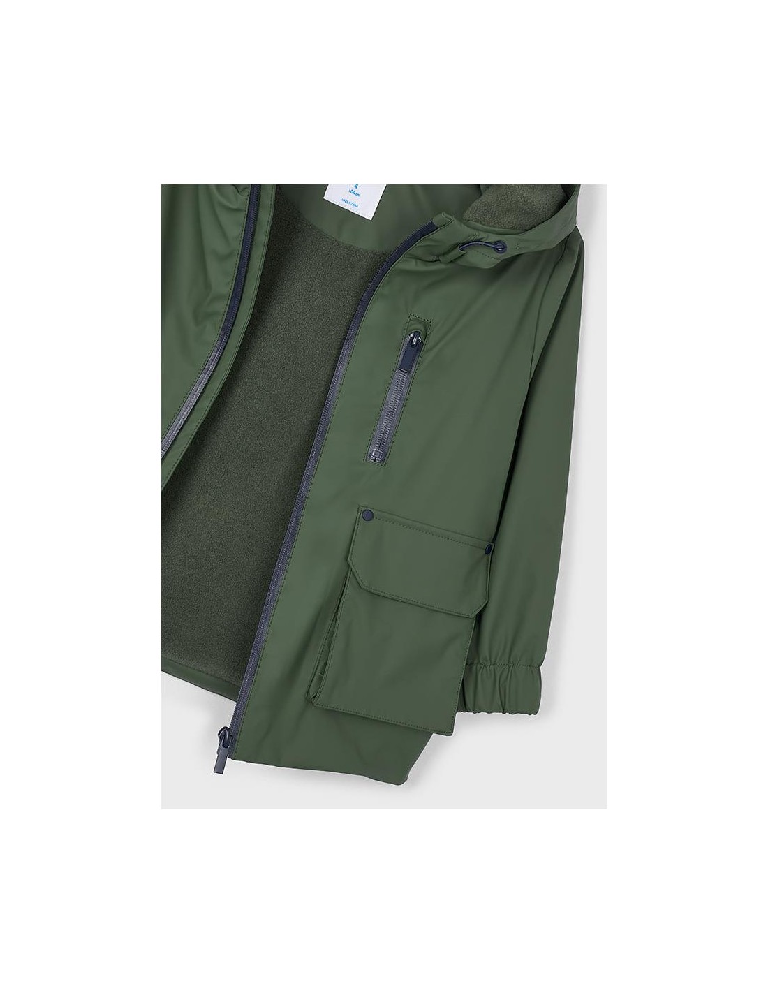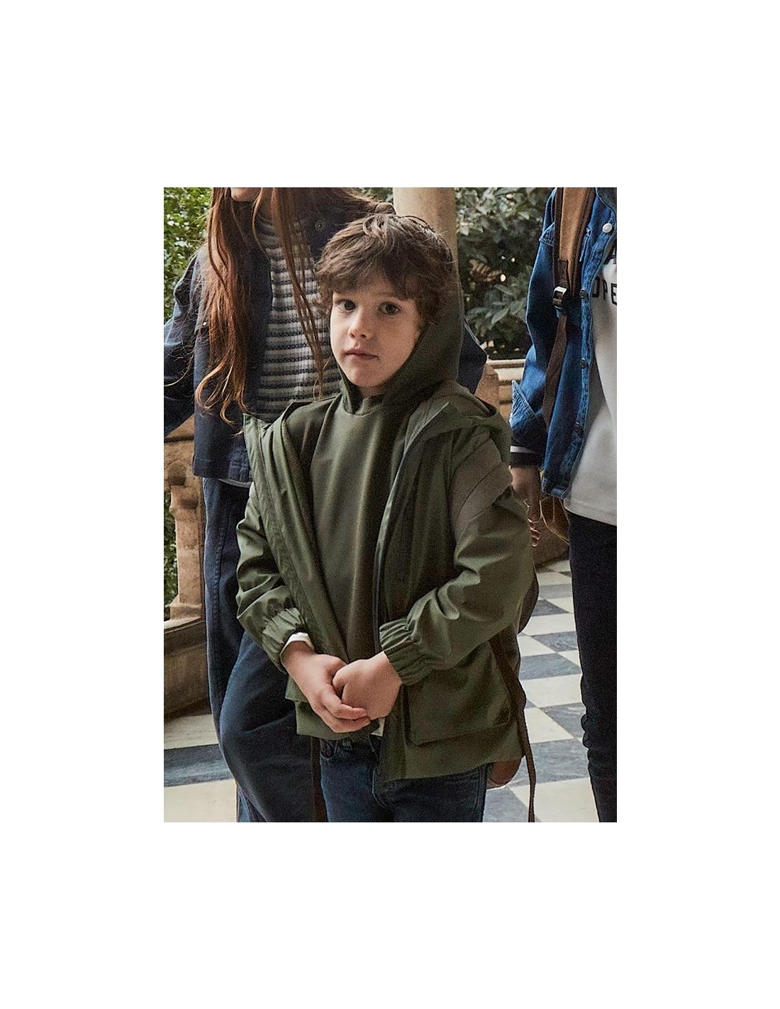 Chubasquero de manga larga para niño. Cuello con capucha. Cierre central delantero con cremallera. Suave forro interior de poliéster. Puños de punto elástico para un mejor ajuste. Bolsillos funcionales en la parte delantera.