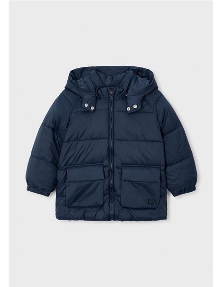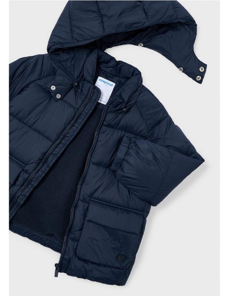 Chaquetón de manga larga para niño con puños elásticos. Cuello con capucha desmontable. Cierre central delantero con cremallera. Diseño acolchado con guata. Interior de forro polar. Bajo elástico para un mejor ajuste. Bolsillos en los laterales. Modelo perteneciente a nuestra colección Mayoral Basic, una prenda esencial en su armario para completar cualquier look.