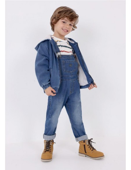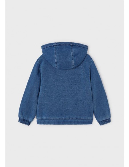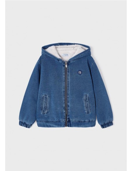 Cazadora de manga larga para niño con puños elásticos. Modelo con capucha. Silueta de líneas relajadas con hombros caídos. Cierre central delantero con cremallera. Tejido vaquero cómodo y combinable para los looks diarios. Forro interior de punto borrego.