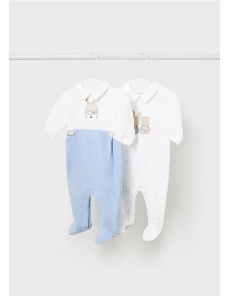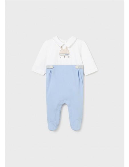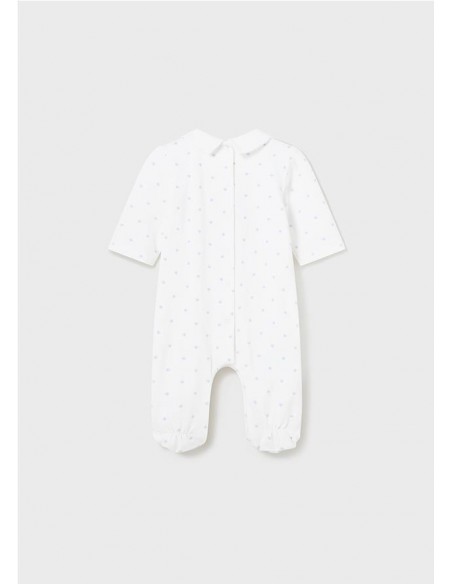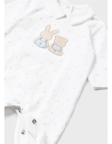 Pelele de manga larga para recién nacido. Cuello camisero. Cierre con botones a presión en la parte posterior.