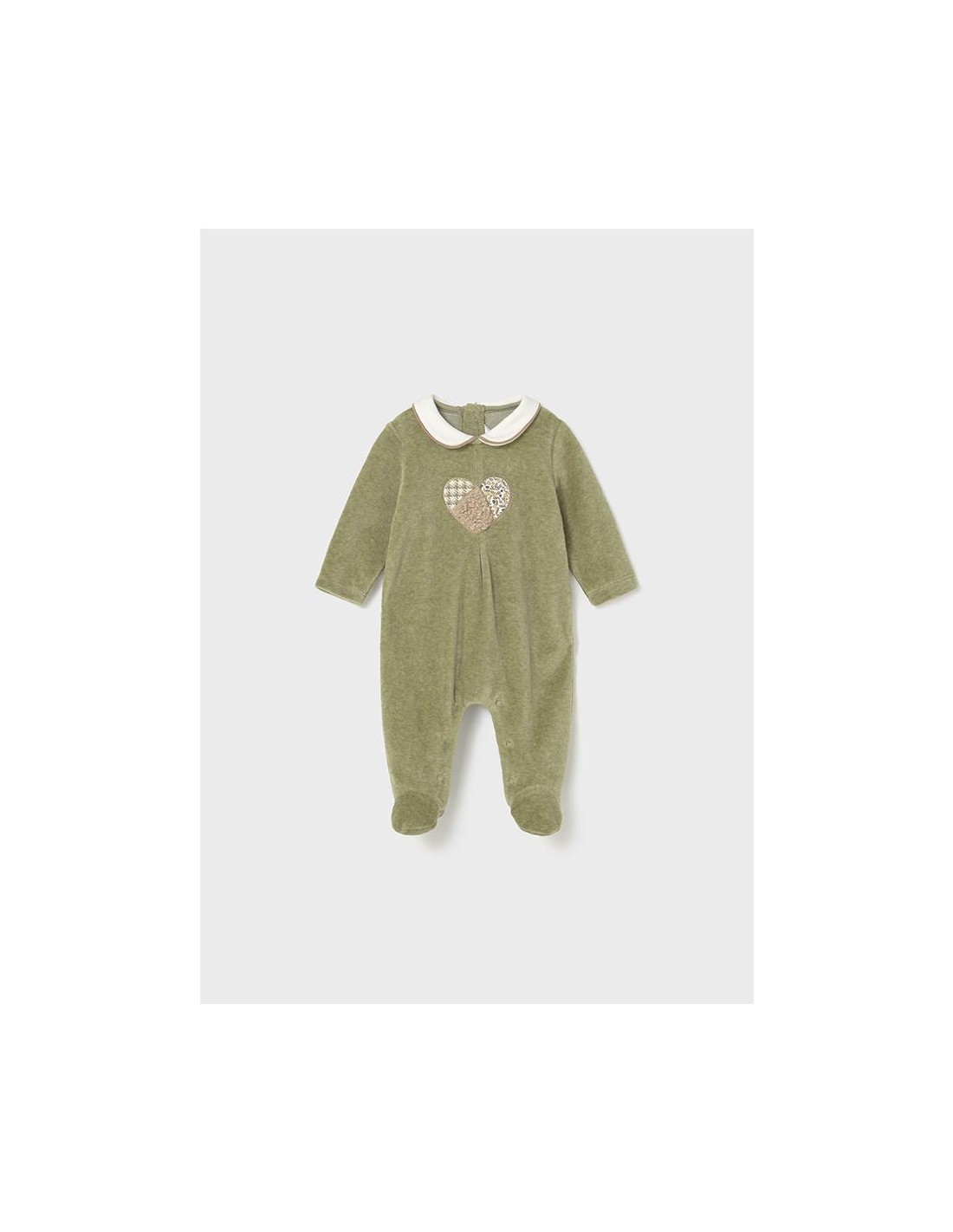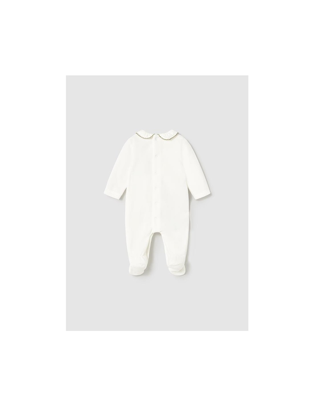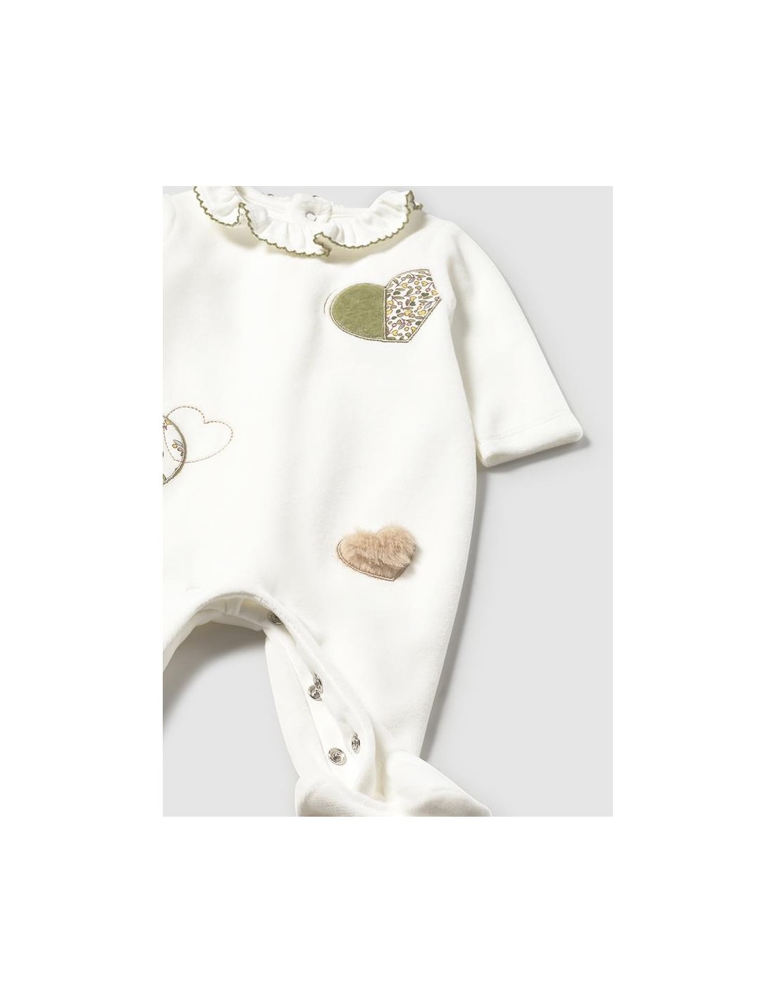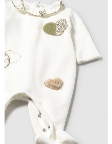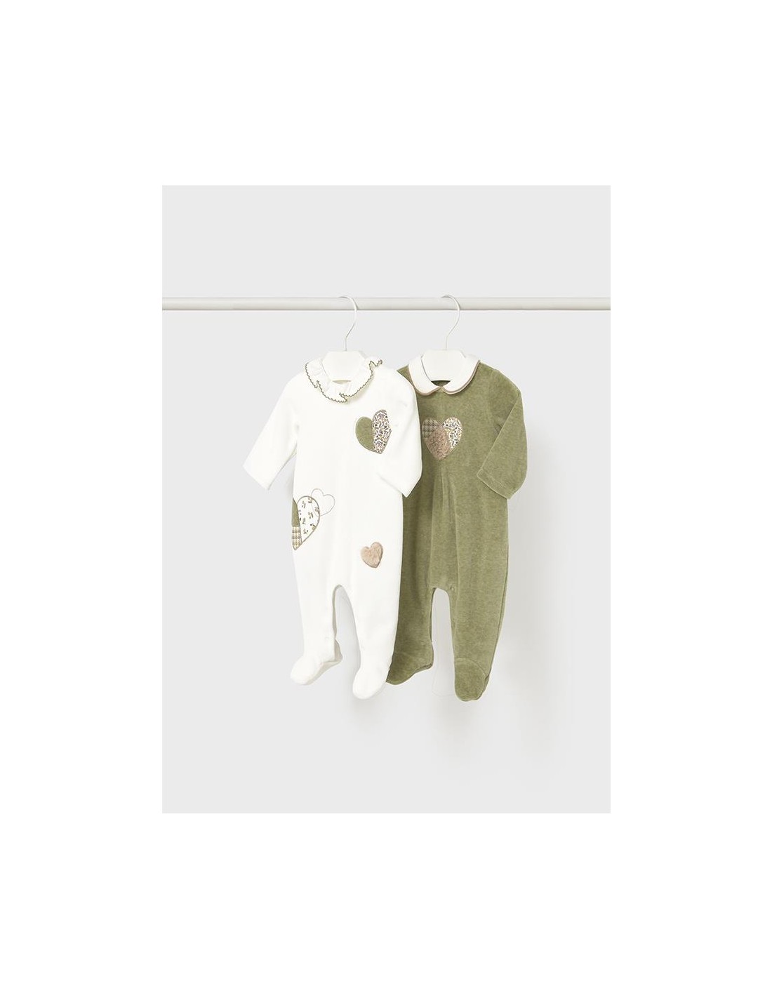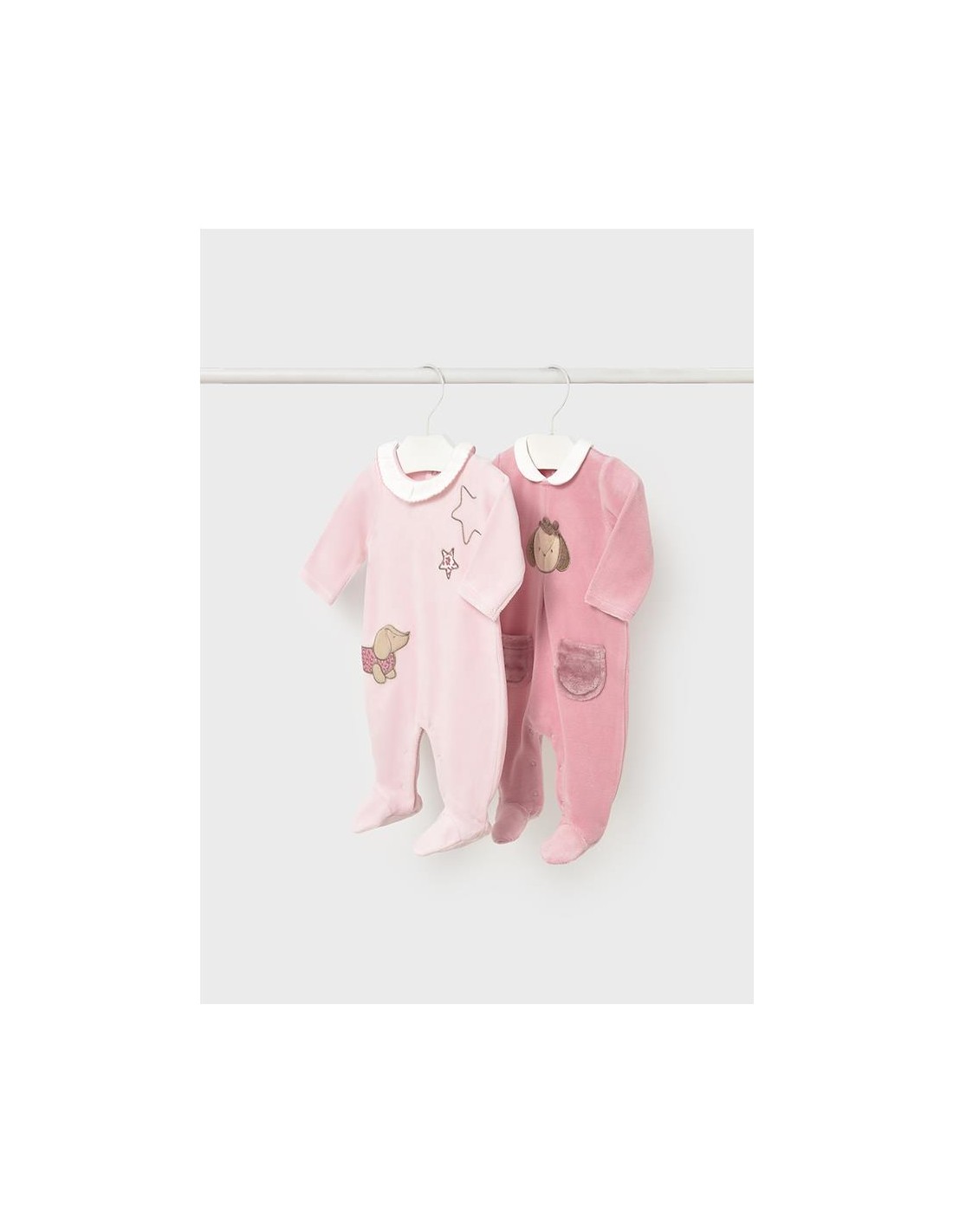 Set de dos peleles de manga larga para recién nacida, cuello bebé, cierre con botones a presión en la parte posterior. Botones a presión en la entrepierna para facilitar la puesta de la prenda. Elementos de adorno: aplique decorativo, bordado.