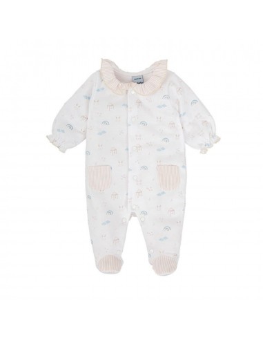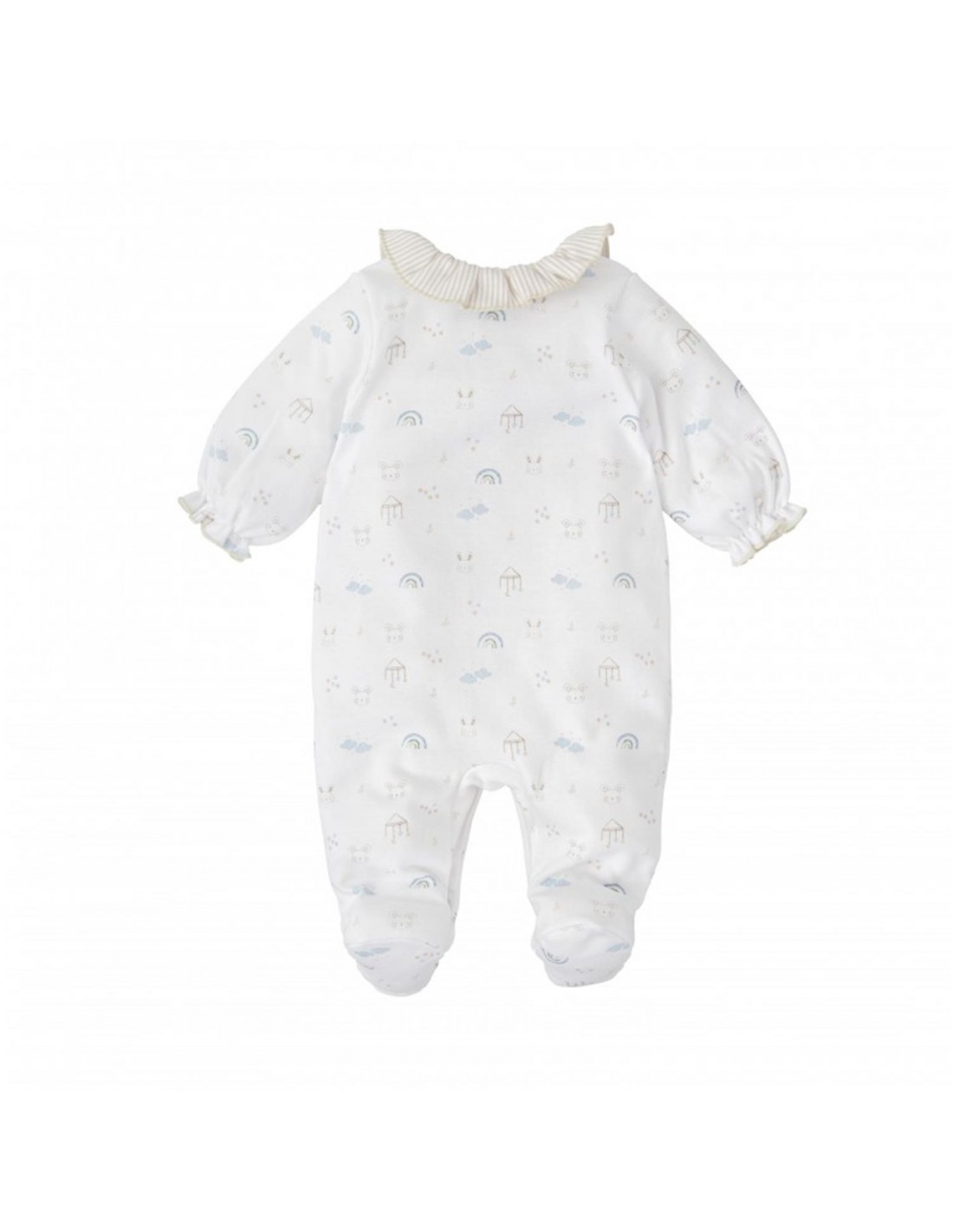 Este encantador pelele de manga larga está confeccionado en algodón 100% suave y delicado con la piel del bebé. Su estampado en tonos pastel con arcoíris, nubes, casitas y caritas de animalitos aporta una estética dulce, neutra y armoniosa.