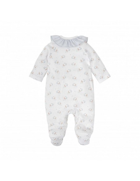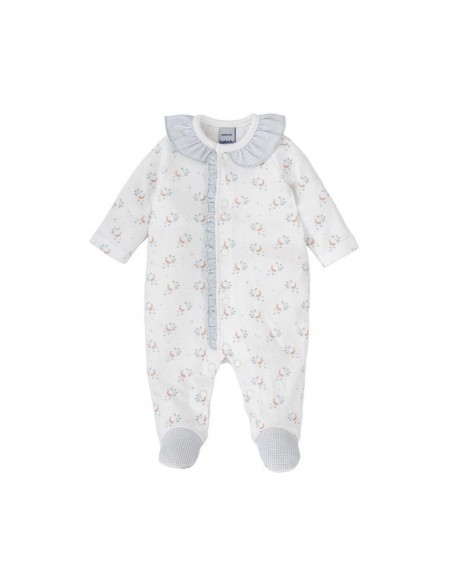 Este pelele es una prenda ideal para los primeros días del bebé, con un diseño dulce, funcional y lleno de encanto. Confeccionado en suave algodón con un delicado estampado floral sobre fondo blanco, destaca por su cuello con volante fruncido en cuadros vichy celeste y la tapeta central con ribete a juego.