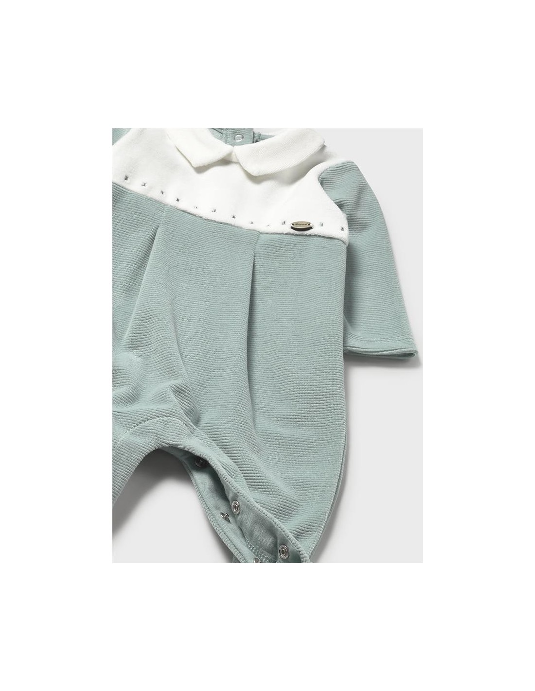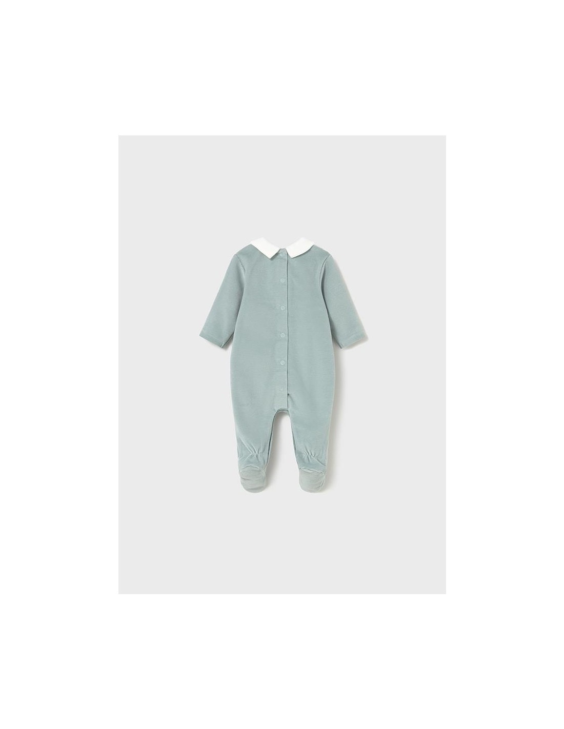 Pelele de manga larga para recién nacido. Diseño con pies. Cuello camisero. Botones a presión en la entrepierna para facilitar la puesta de la prenda. Cierre con botones en la espalda para facilitar la puesta de la prenda. Elementos de adorno: bordados. Las tallas mayores de este modelo