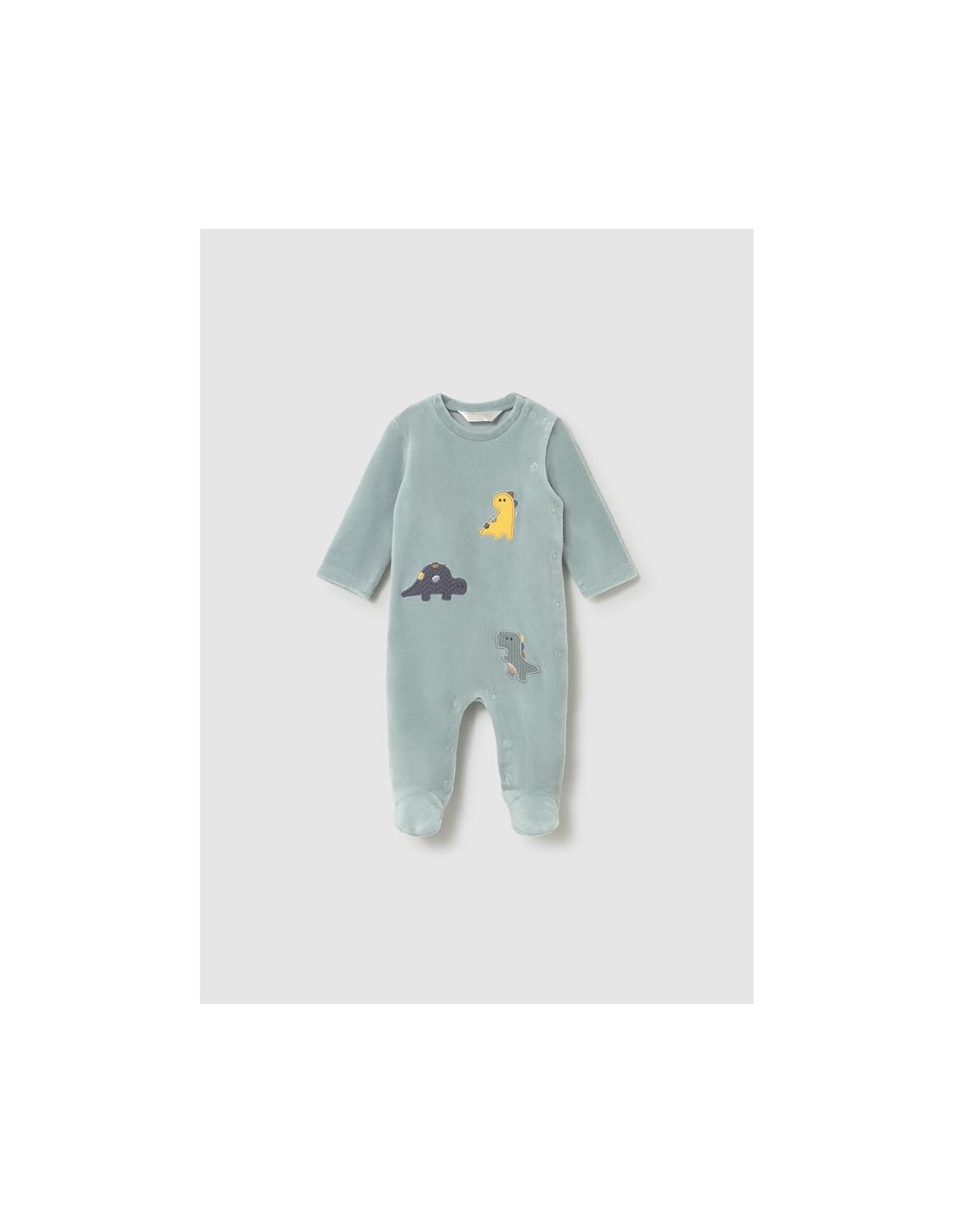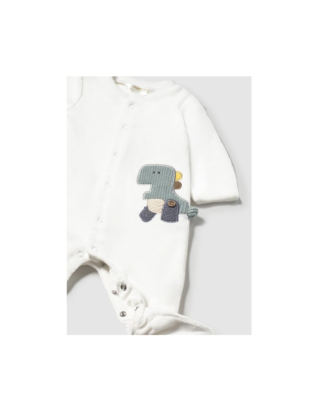 Pijama de manga larga para recién nacido. Cuello redondo. Cierre con botones a presión en la parte delantera. Botones a presión en la entrepierna para facilitar la puesta de la prenda. Cálido tejido de algodón con tacto suave y aterciopelado. Elementos de adorno: bordados. Las tallas mayores de este modelo (12 y 18 meses) presentan una suela antideslizante.Cuello cruzado y abertura lateral completa que cierra con botones a presión.