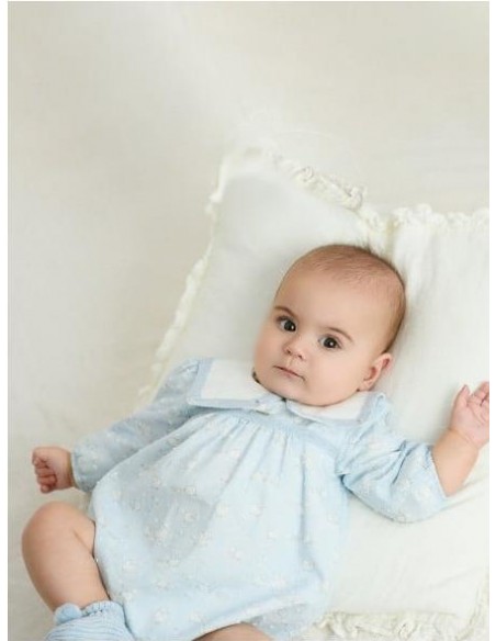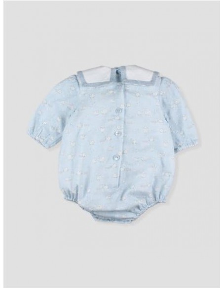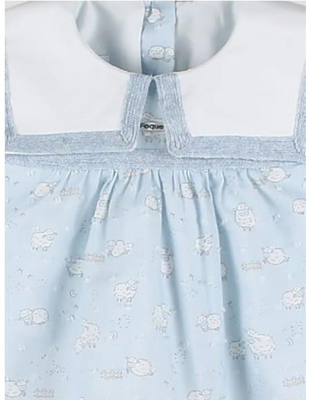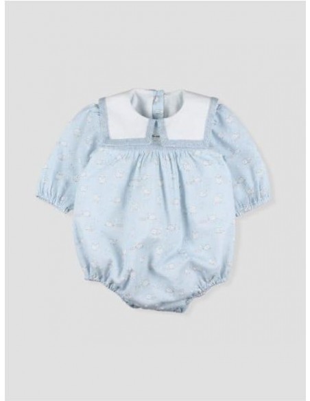 El pelele de la colección Arrullo destaca por su cuello marinero blanco con ribete a contraste y su estampado de ovejitas que lo hace único y entrañable. Con manga larga y puños elásticos, ofrece comodidad y libertad de movimiento para los más pequeños. Abrocha en la espalda y entrepierna para facilitar el cambio