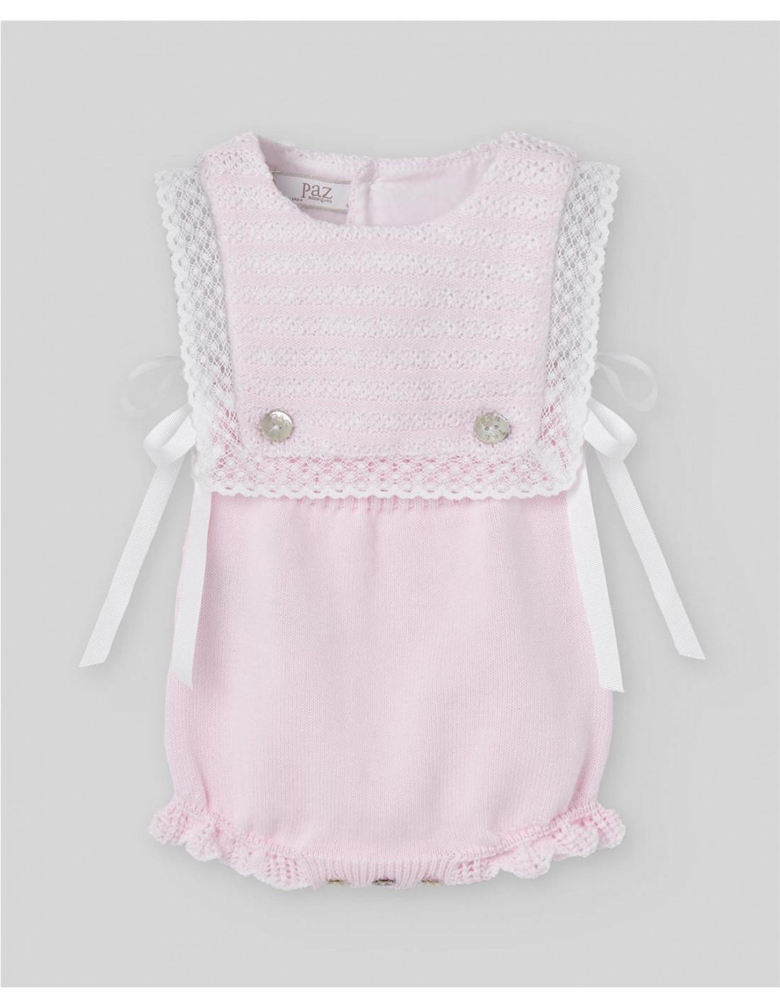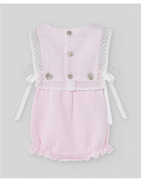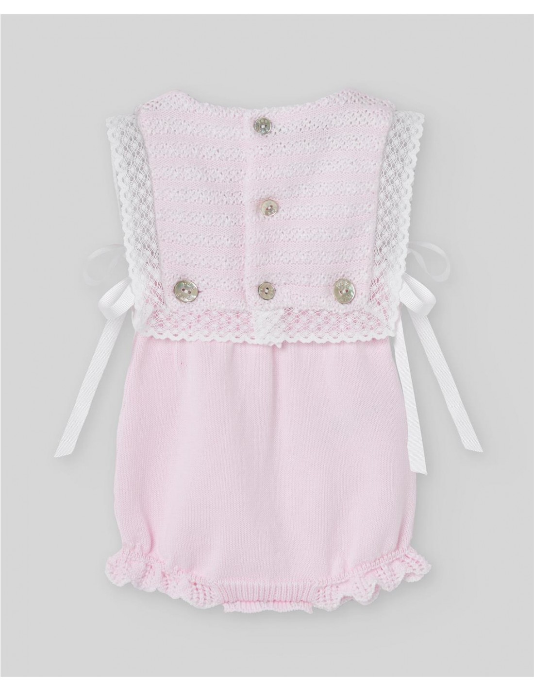 Ranita de punto para bebé con delicado cuerpo tricotado, detalles de encaje en los tirantes y botones decorativos en el pecho, perteneciente a la colección "Alaia".