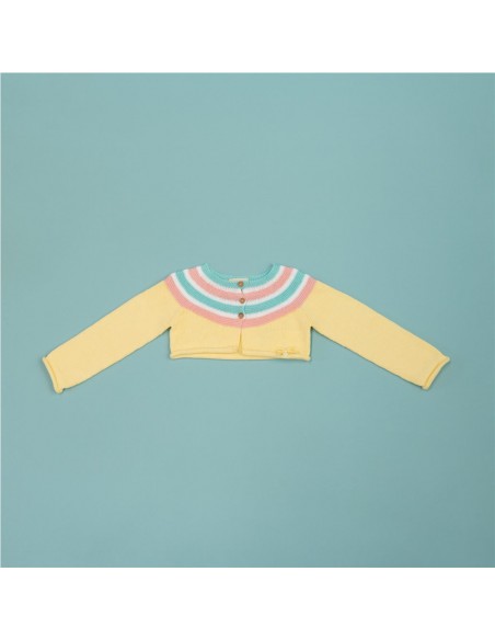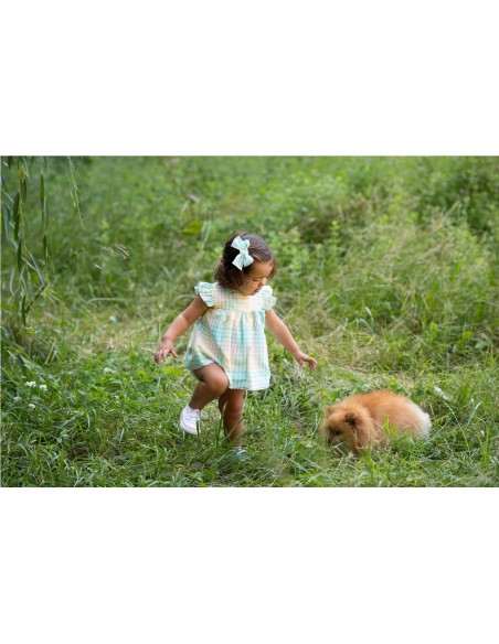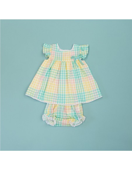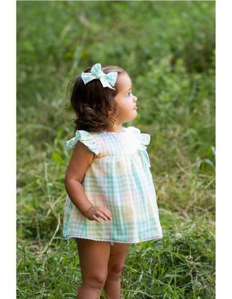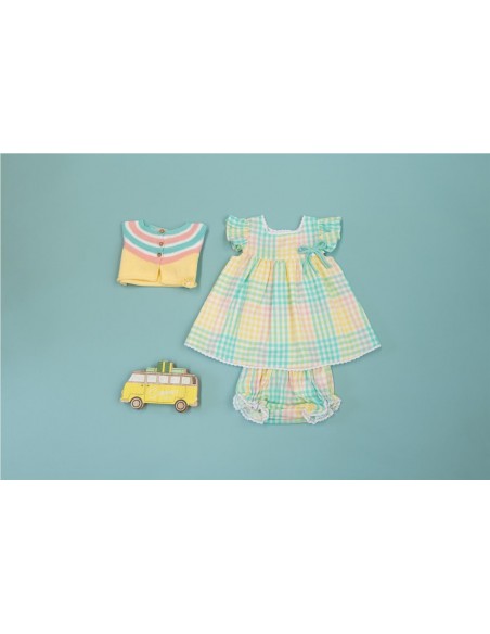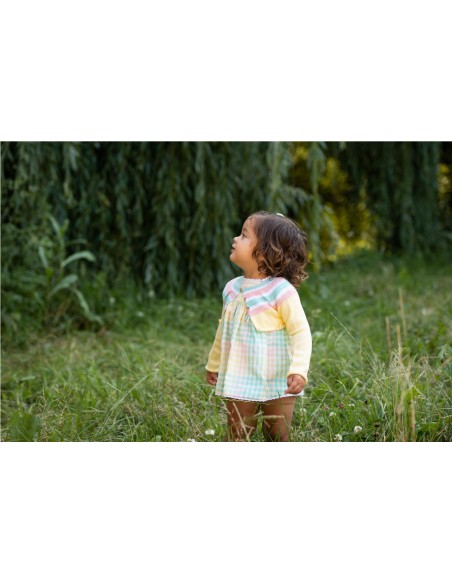 Jesusito vichy multicolor, corte en la pechera y lazo de algodón de adorno, cierre con botones en la parte trasera y volante en la manga. Ranita coordinada en la misma tela.Completa el conjunto la rebeca cortita en tonos coordinados con el jesu. Pinza con lazo disponible así como diferentes looks para coordinar hermanitos.
