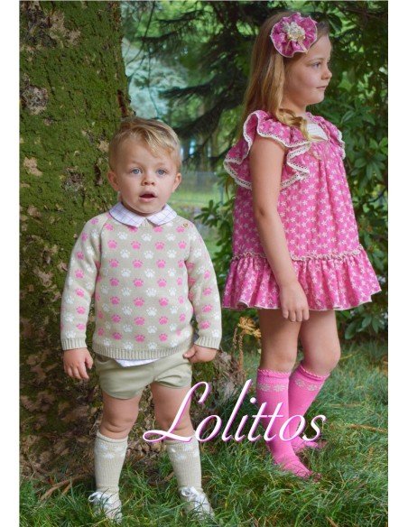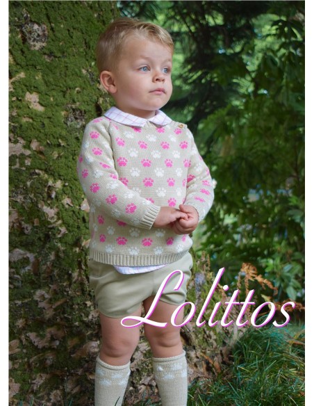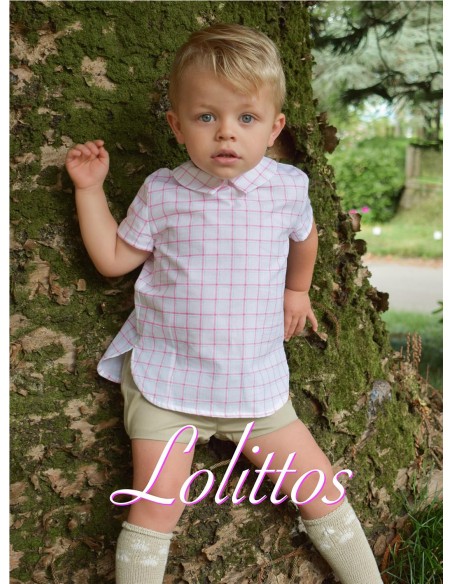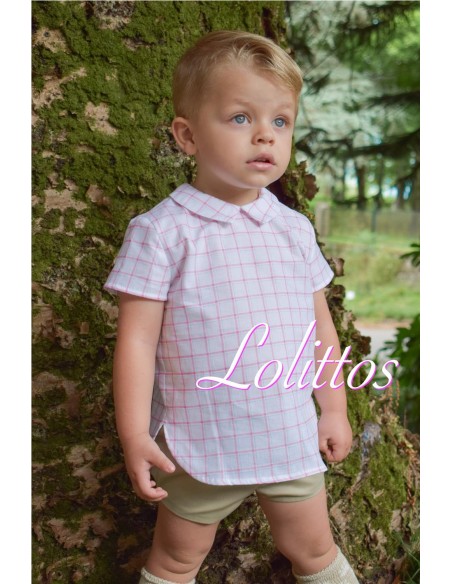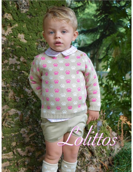 Conjunto 3 piezas para niño de la colección Grecias de Lolittos. Pantalón rana, recta delante en la pierna y goma fruncida en la parte trasera, camisa con cuello pico y cierre trasero blanca con cuadro grande rosa y original jersey con huellas coordinado en camel y tonos de rosas.
