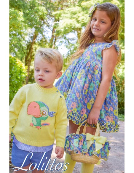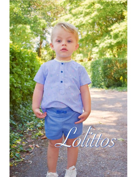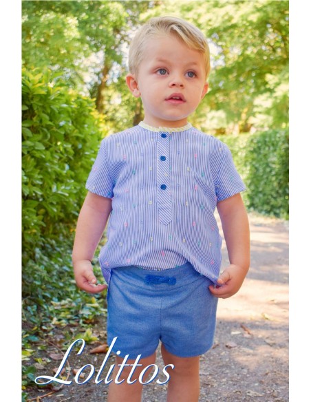 Conjunto 3 piezas para niño de la colección Alleres de Lolittos. Pantalón rana, recta delante en la pierna y goma fruncida en la parte trasera en tejido tipo denim suave, camisa de plumeti multicolor rallado y jersey coordinado con el original Loro de la colección.