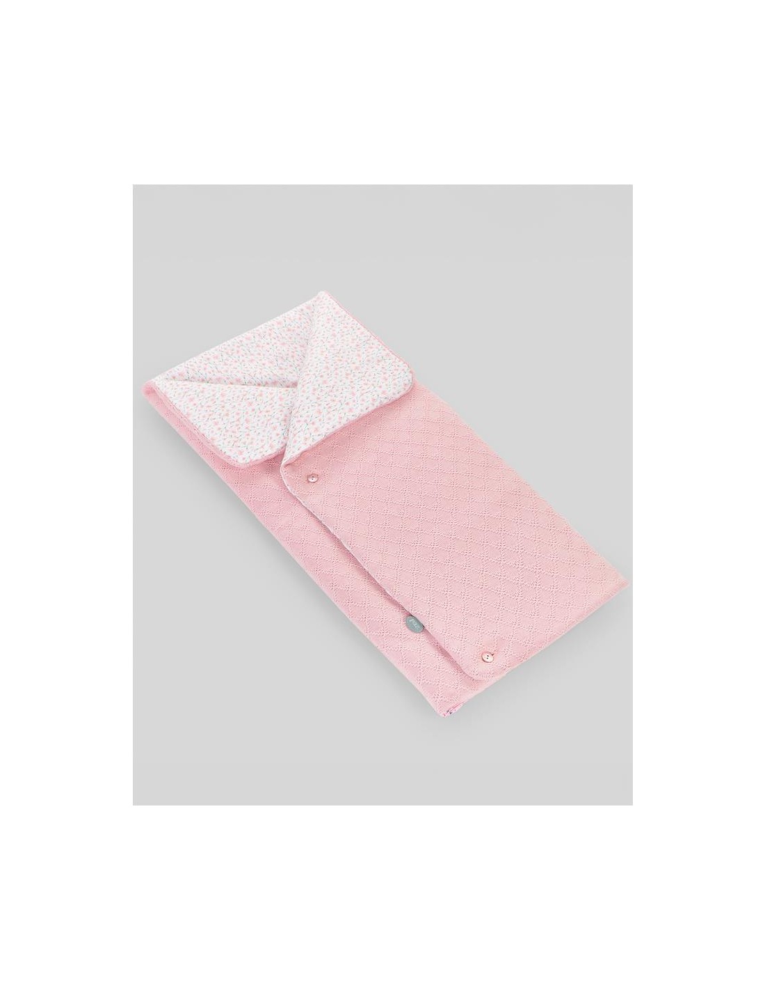 Saco nana de punto de algodón con interior de otomán de estampado floral y botones al tono para cerrar. Se abre totalmente para usar de cambiador. Tiene ojales traseros para porta bebé. Ideal para portar al bebé.