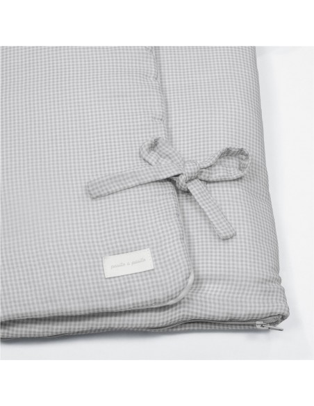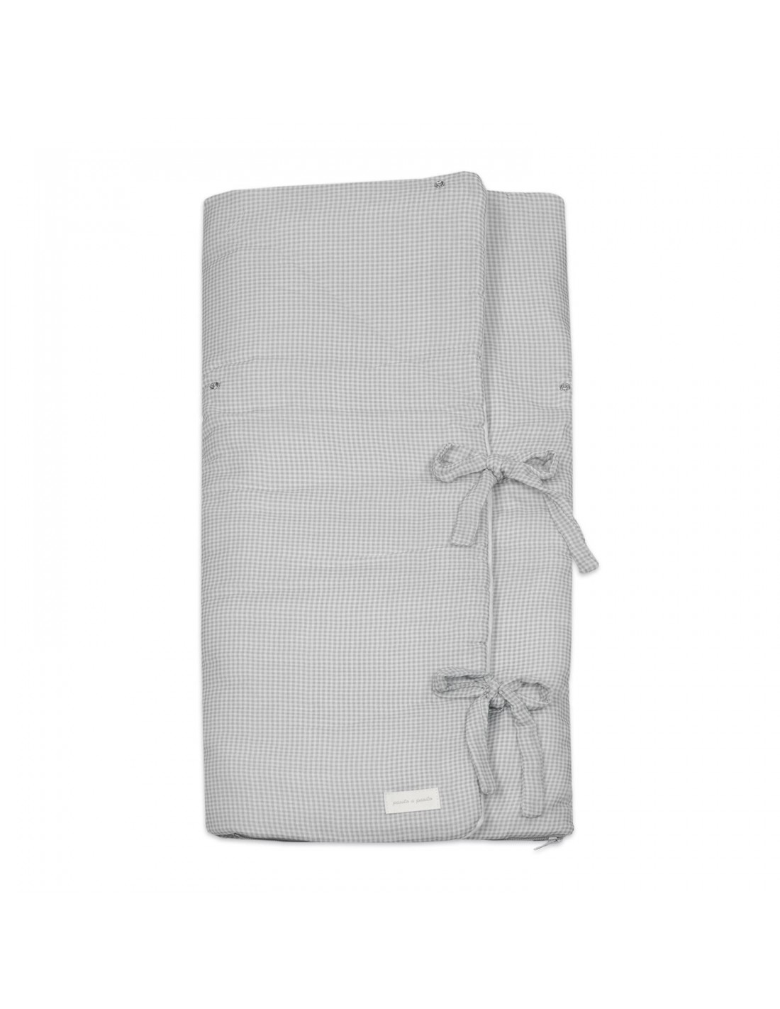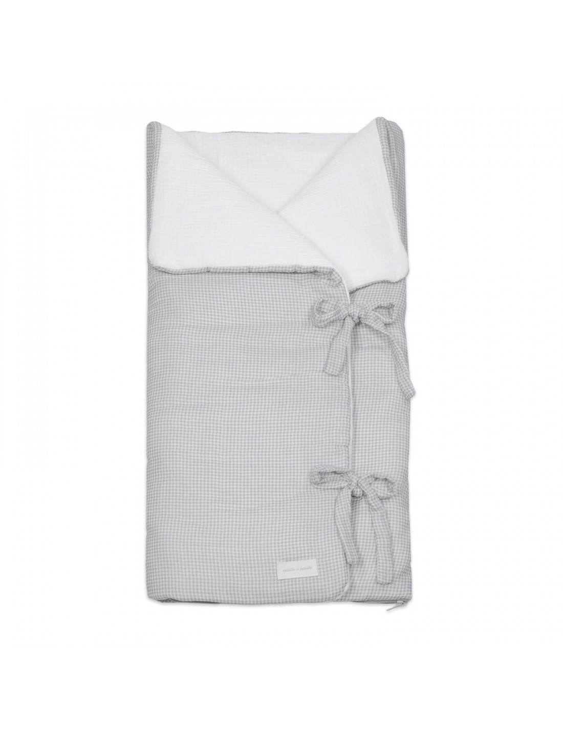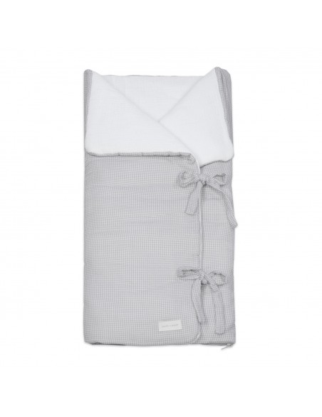Saco arrullo o saco manta Little Bloom Vichy gris de Pasito a pasito. Está fabricado con una suave muselina de cuadors estampada en el exterior y muselina lisa en el interior de 100% algodón. Ideal para los primeros dias del bebé. Es perfecto para los primeros paseos en el capazo. Se convierte en una manta para la cuna. Practico cierre tipo sobre con lazos y cierre con cremallera en la parte inferior en los pies para que el bebé esté abrigado. Gran calidad y mucho estilo. Tog 2,5.