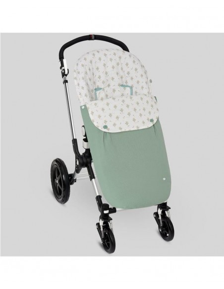 Saco silla universal para sillas de paseo confeccionado en piqué de galleta y con tejido seersucker de algodónestampado de estantapájarosen el interiorpara convertir el saco en colchoneta, con refuerzo de polipiel en los pies, relleno de cubrepiés extraíble.