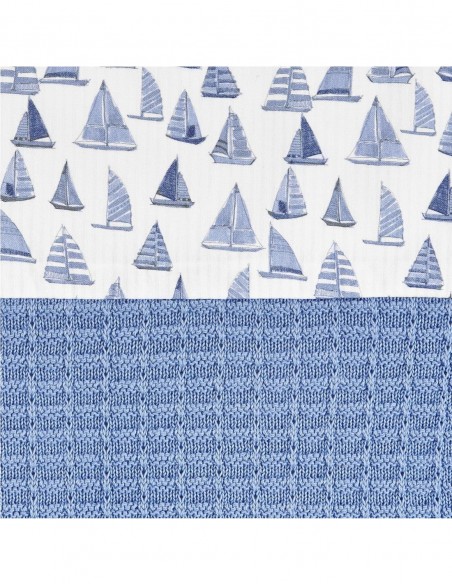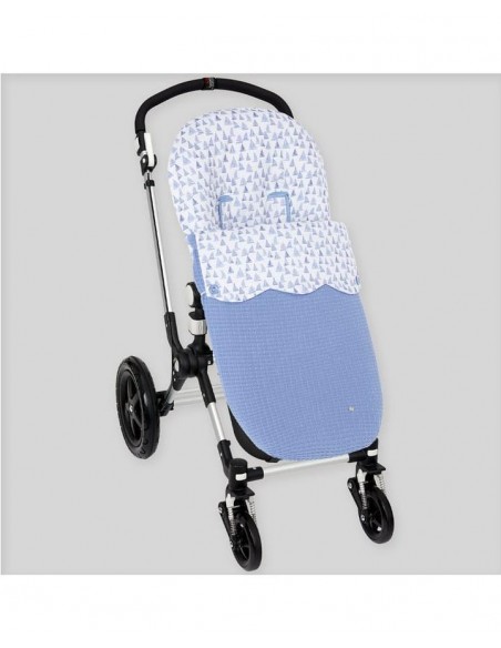 Saco universal para sillas de paseo confeccionado en algodón combinado con estampado de veleros al tono. Embozo cuadrado y reversible con tejido de rayas, cremalleras laterales para convertir el saco en colchoneta y refuerzo de polipiel en los pies.