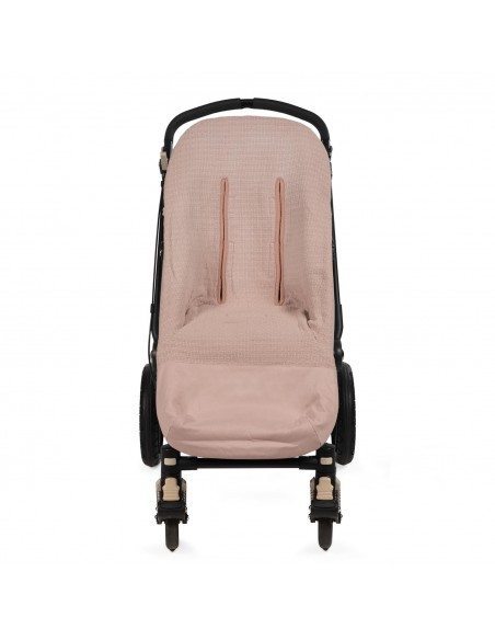 Funda Icon Rose de Pasito a pasito en tejido leno y bambula muy suave ideal para cubrir la silla de paseo provista de saco. Está diseñado en el respaldar con una capa de tejido en material transpirable que aísla la humedad y evita la sudoración excesiva del bebe haciendo el paseo más confortable. Relleno de fibra hueca extraíble. Reposapiés en poliéster para facilitar la limpieza. Dispone de varias aperturas (ojales) y ajustes para adaptarla a la mayoría de la sillitas de paseo.