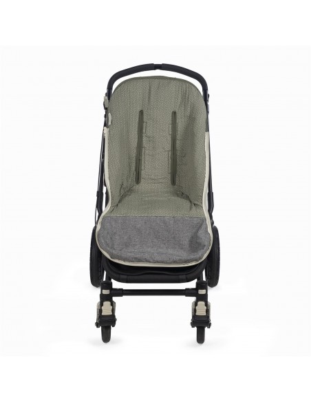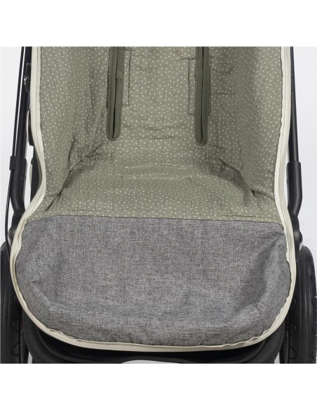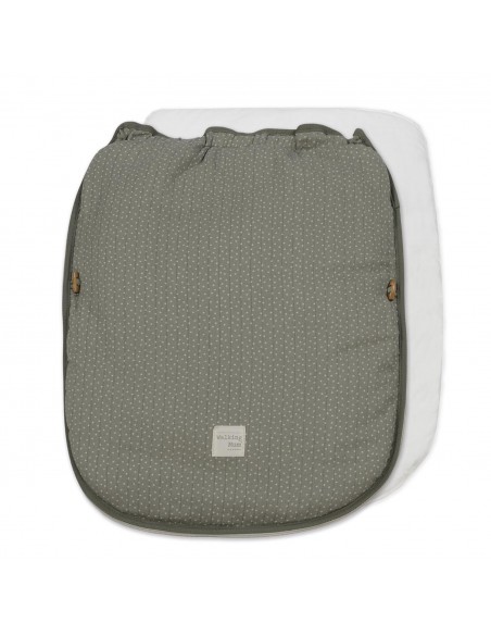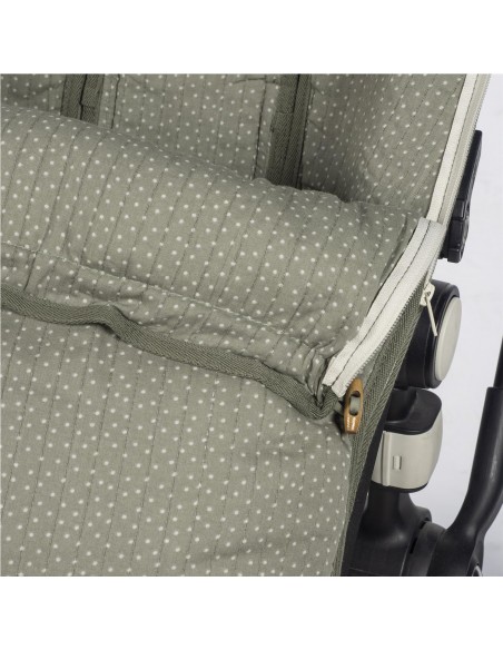 La funda de silla para bebé Poppy Musgo de topitos está fabricado con un tejido de 100% algodón reciclado. Es la funda ideal para cubrir la base de la silla de paseo y viene provista de saco para arropar a tu bebé. Con este saco tu bebé estará cómodo durante los meses de primavera y de otoño. Trasera con material anti-sudoración que evita la sudoración excesiva del bebe. Relleno extraíble. Su esquema dispone de varias aperturas (ojales) y ajustes con los que se te hará más fácil adaptarlo.