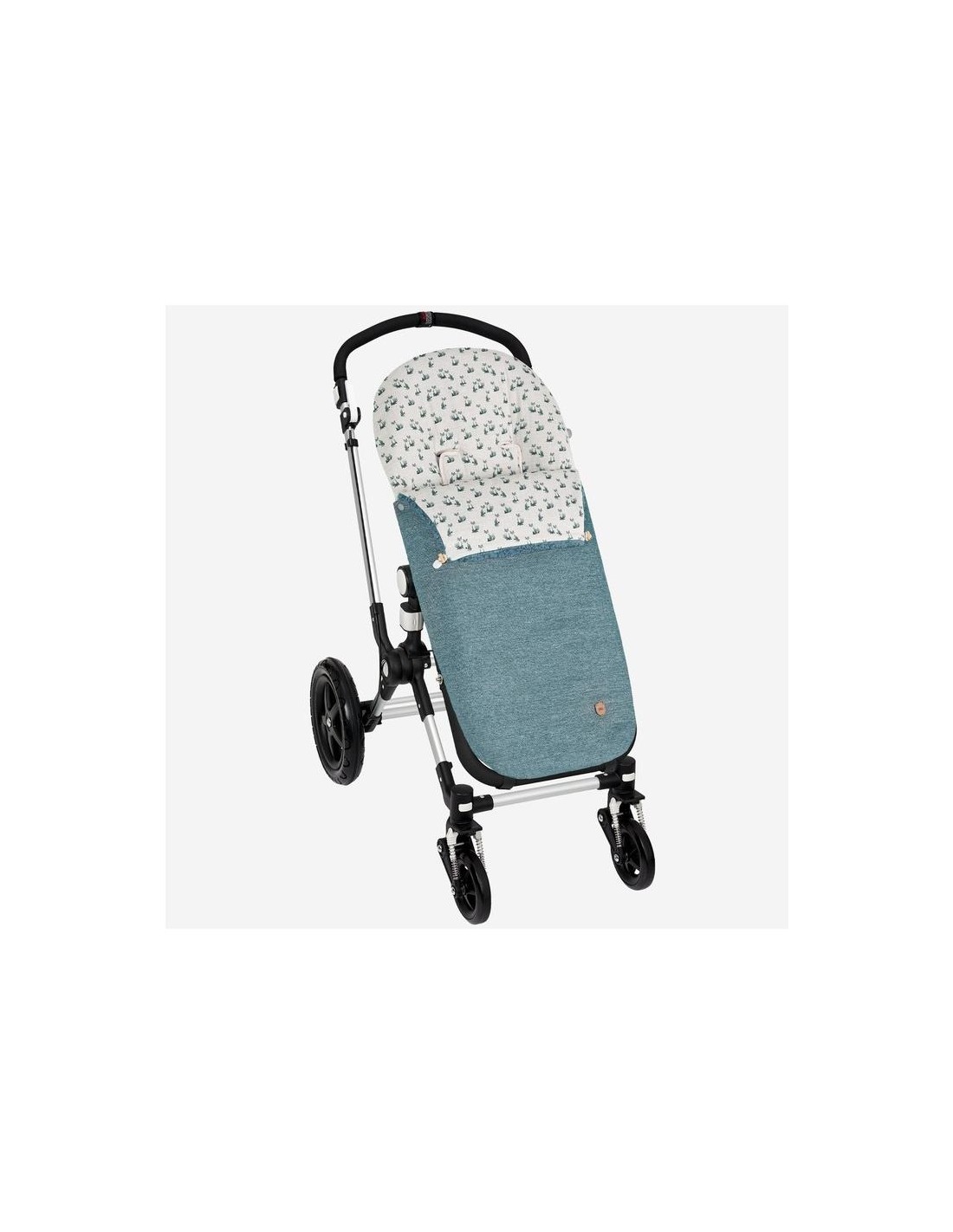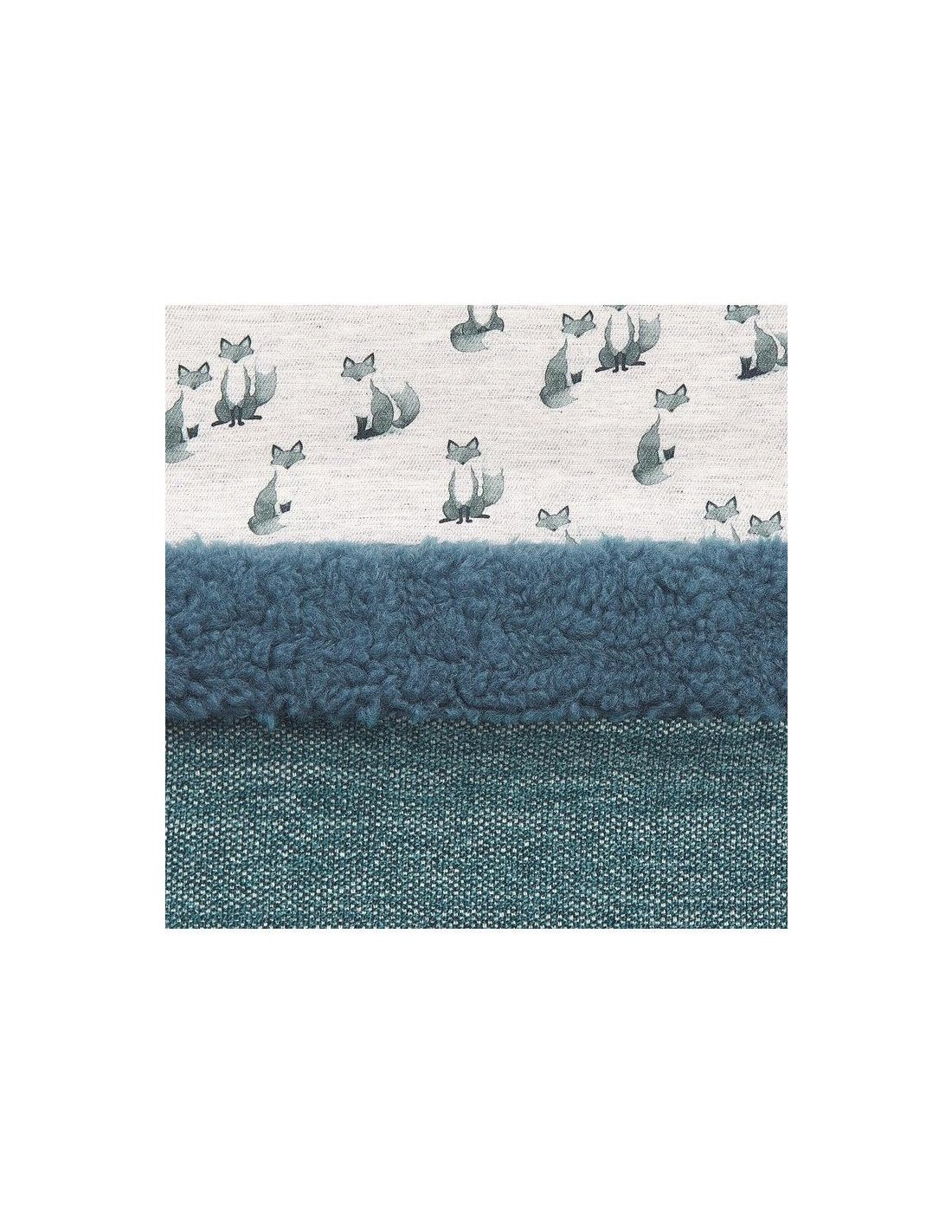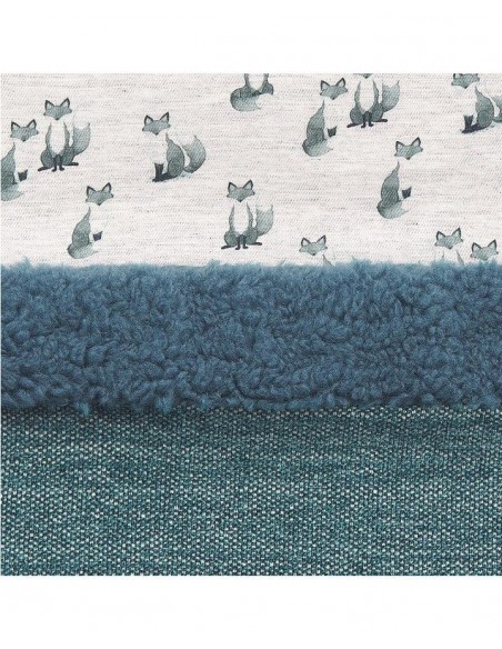 Saco universal para sillas de bebé confeccionado en tejido teflonado exterior, resistente al agua, combinado con estampado de zorros. Embozo reversible con pelo borreguito. Cremalleras laterales para convertir el saco en colchoneta. Relleno extraíble. Colchoneta interior de tela. composición