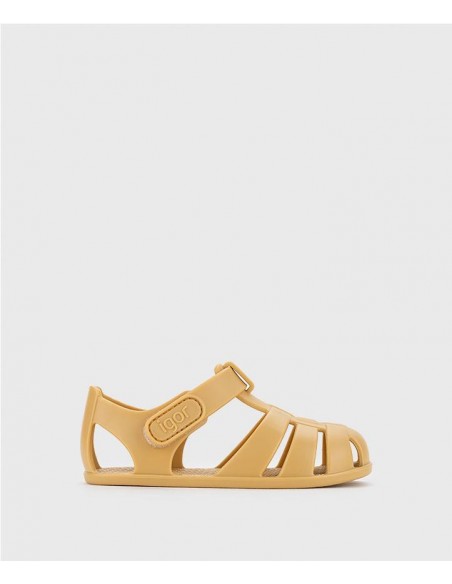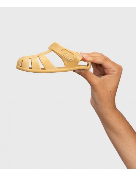 Cangrejera diseñada en concepto barefoot, cero drop, flexible y blandita, fabricada con al menos un 50% de pvc reciclado libre de ftalatos y cierre adherente.