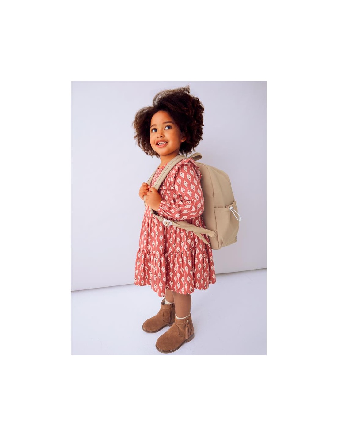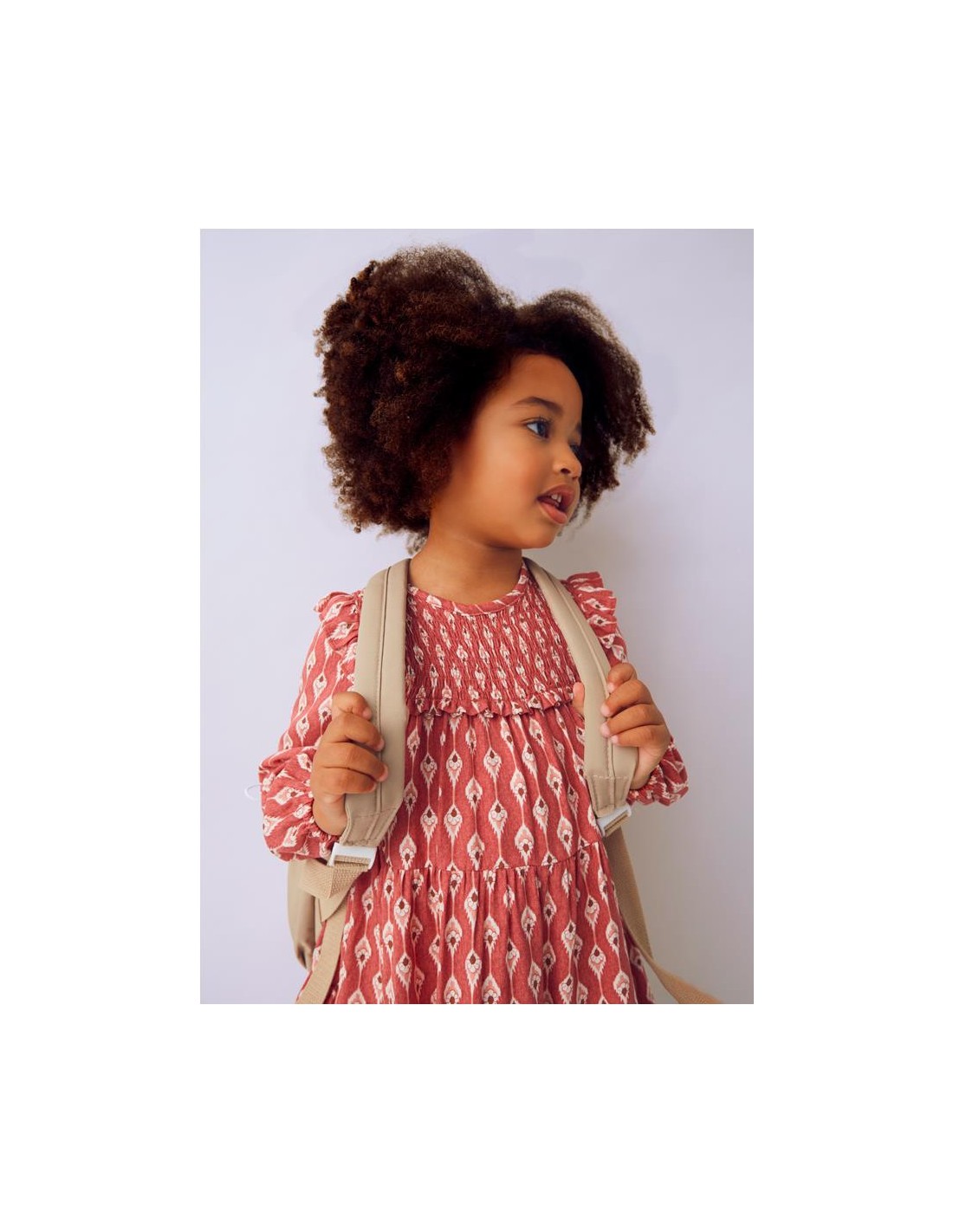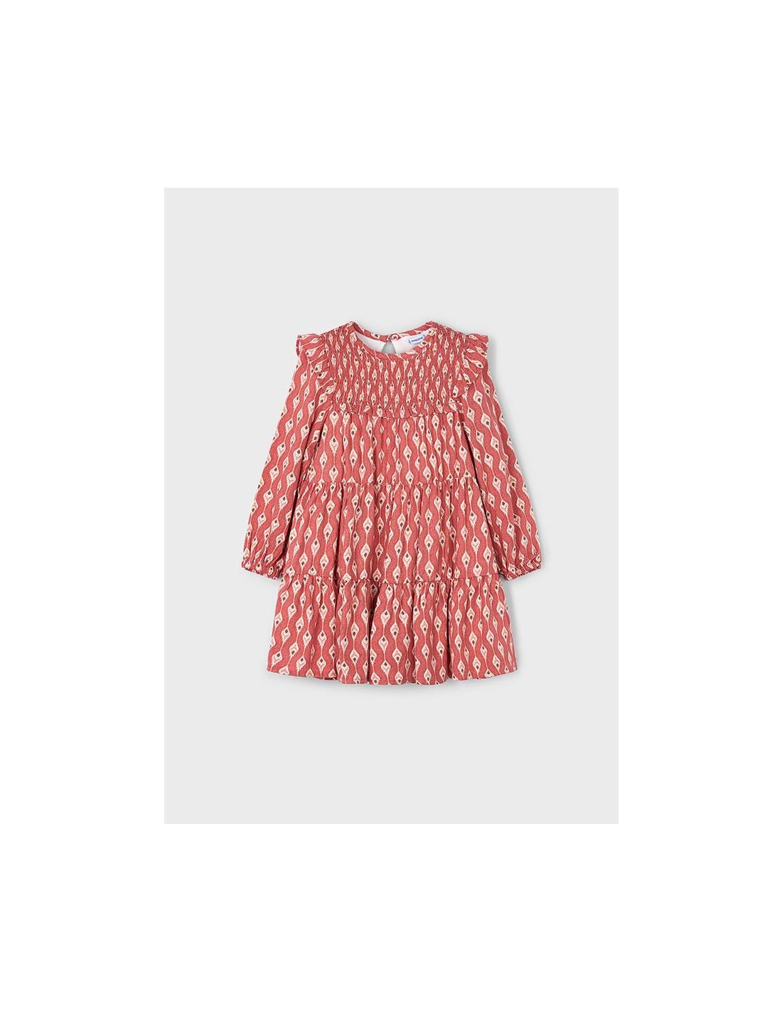 Vestido de manga larga para niña con volantes en los hombros. Cuello redondo. Cierre con un único botón. Tejido cálido ideal para los días más fríos. Este modelo lleva detalles de nido de abeja. Modelo con rizo. Diseño estampado.