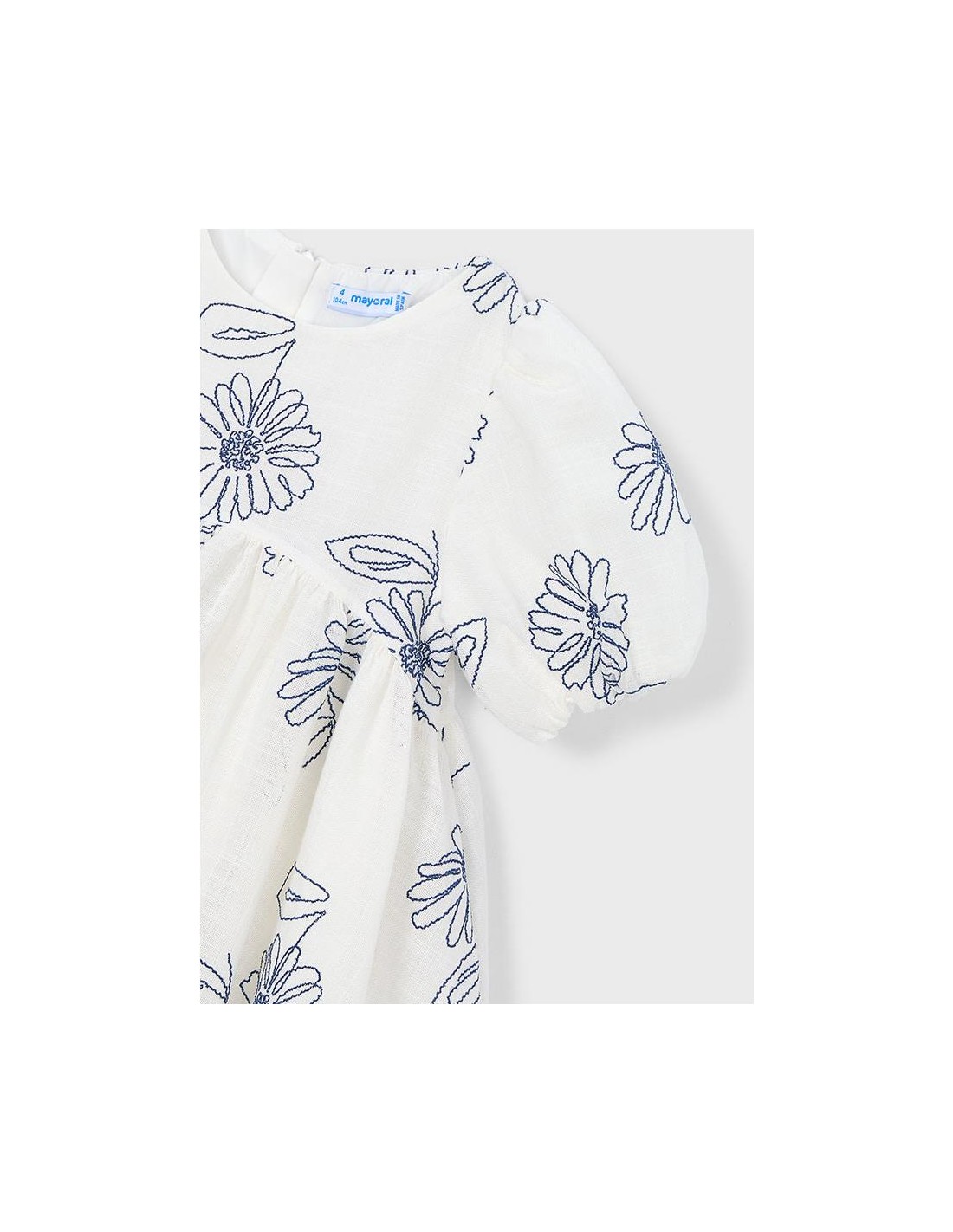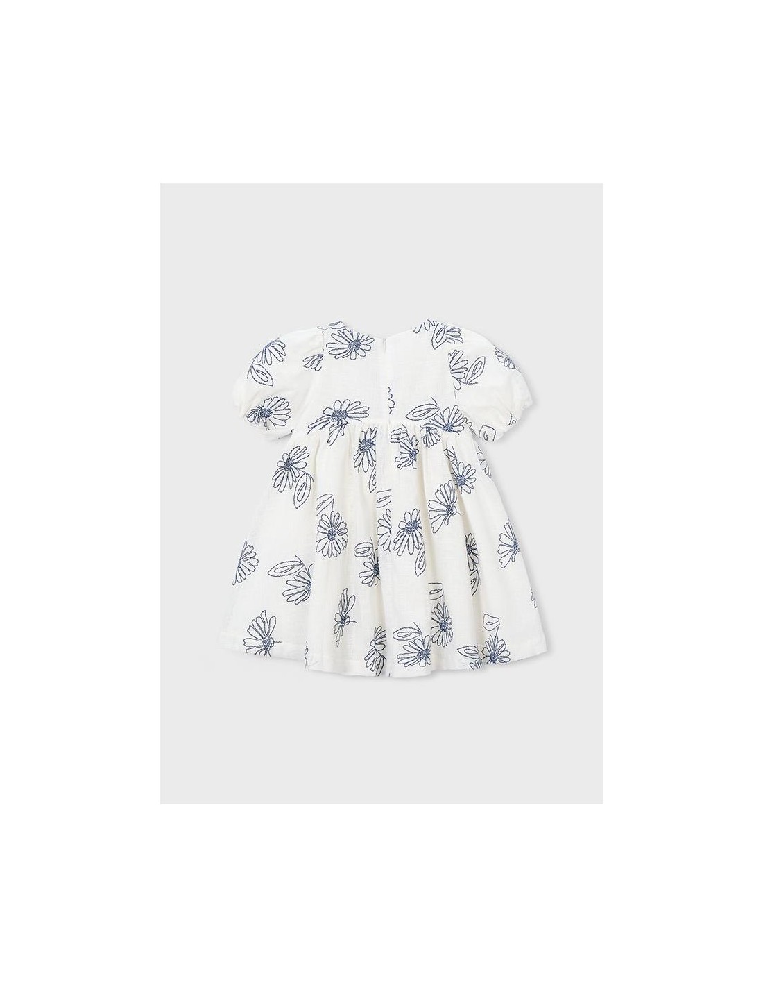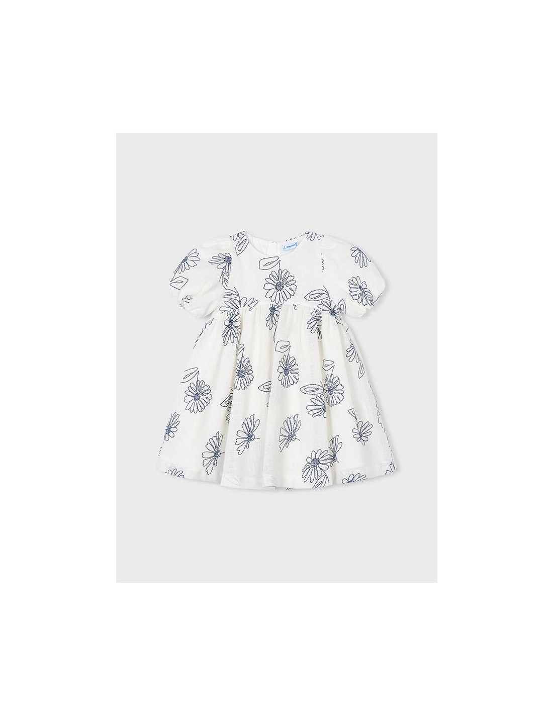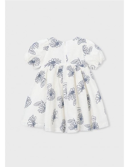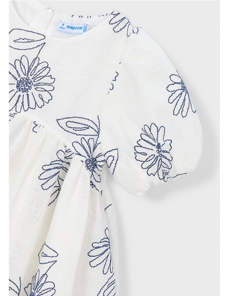 Vestido de manga corta con flores bordadas con suello redondo y mangas cortas abullonadas con goma elástica. Diseño de corte amplio con flores bordadas en contraste, cremallera trasera invisible y con forro interior.