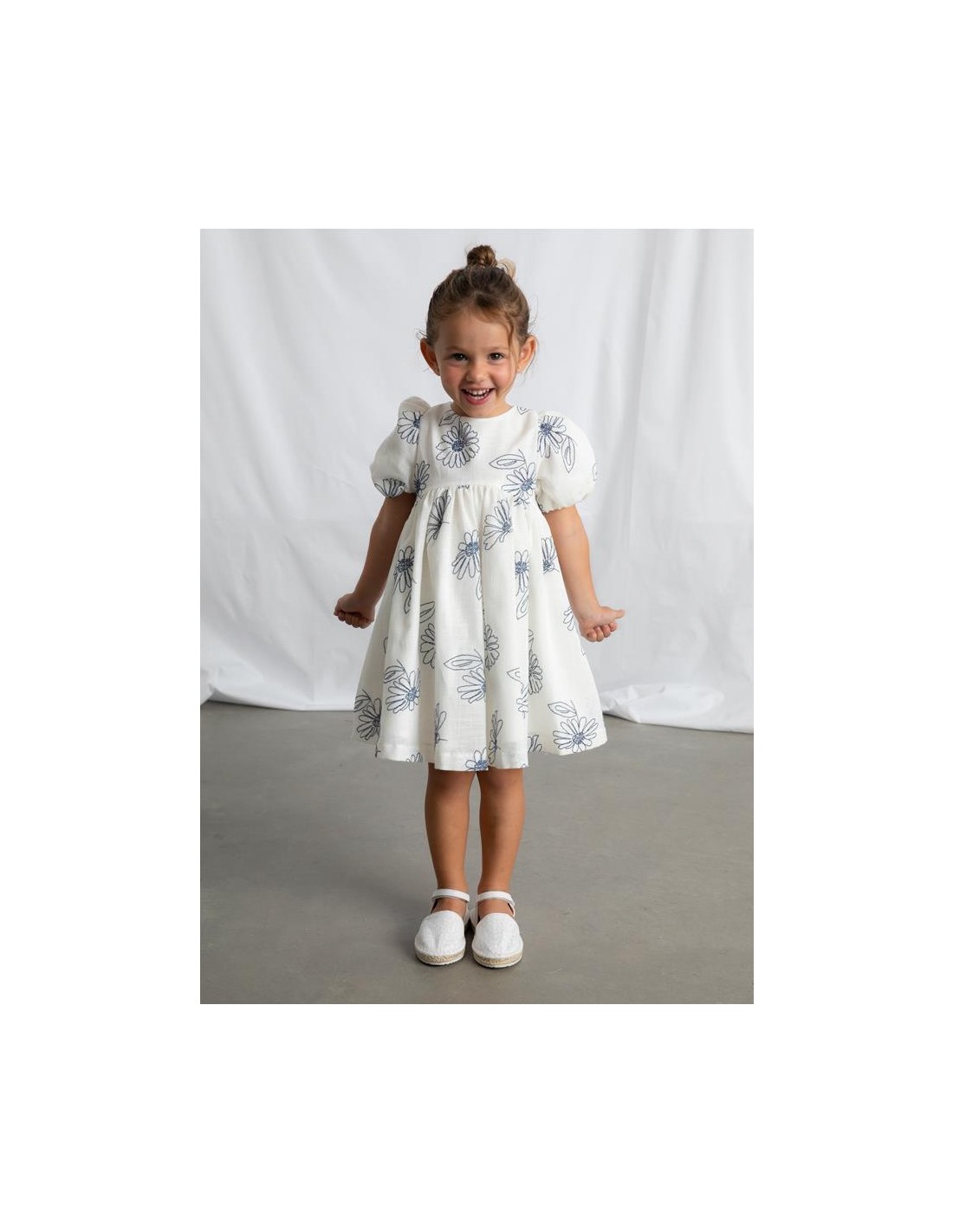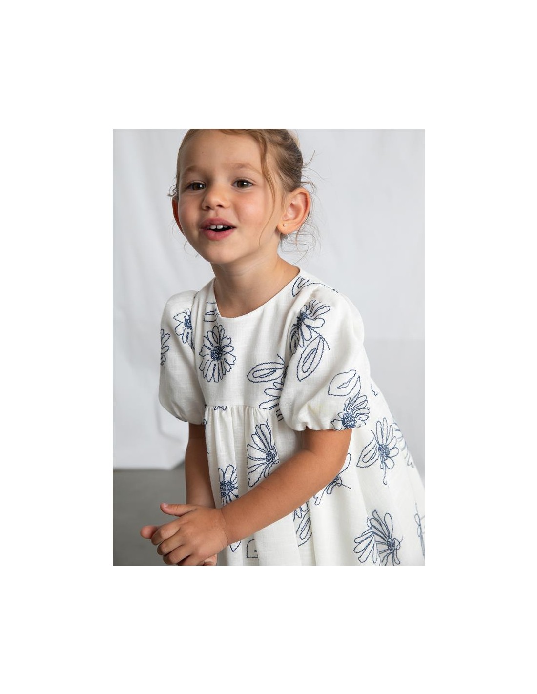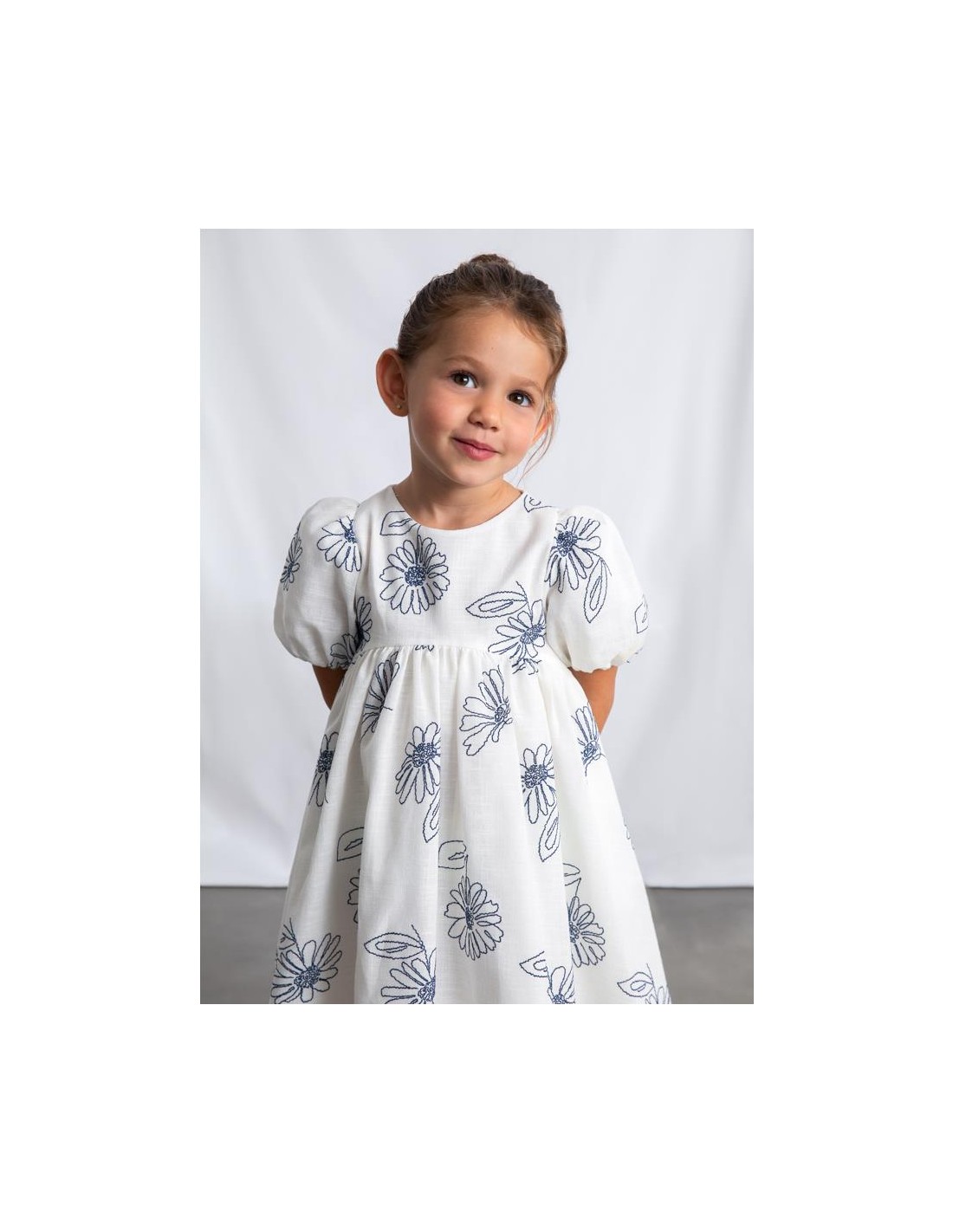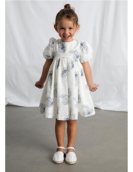 Vestido de manga corta con flores bordadas con suello redondo y mangas cortas abullonadas con goma elástica. Diseño de corte amplio con flores bordadas en contraste, cremallera trasera invisible y con forro interior.