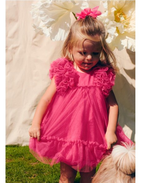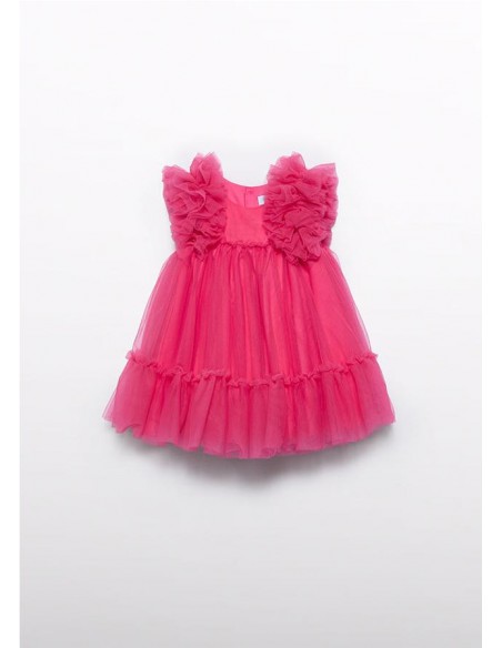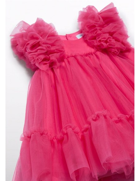 vestido tul bebé con volumen, manga sisa corte en la pechera y volante en todo el bajo.