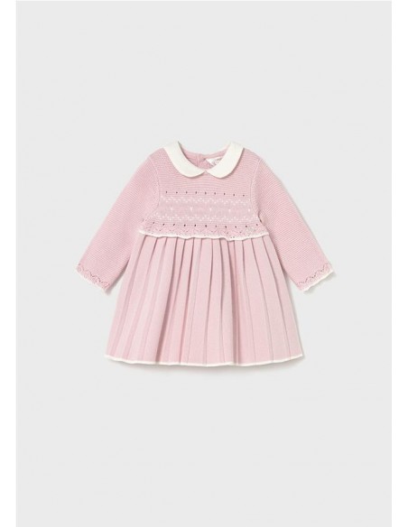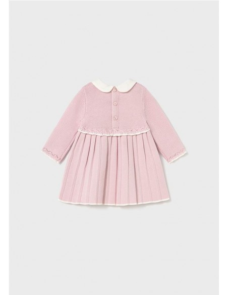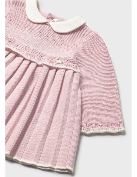 Vestido tricot de manga larga para recién nacida. Cuello bebé. Cierre con botones en la espalda para facilitar la puesta de la prenda. Tejido de punto tricotosa de tacto suave y agradable. Modelo con tableado. Dibujos en punto jacquard.