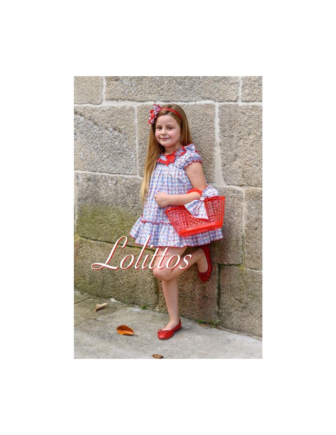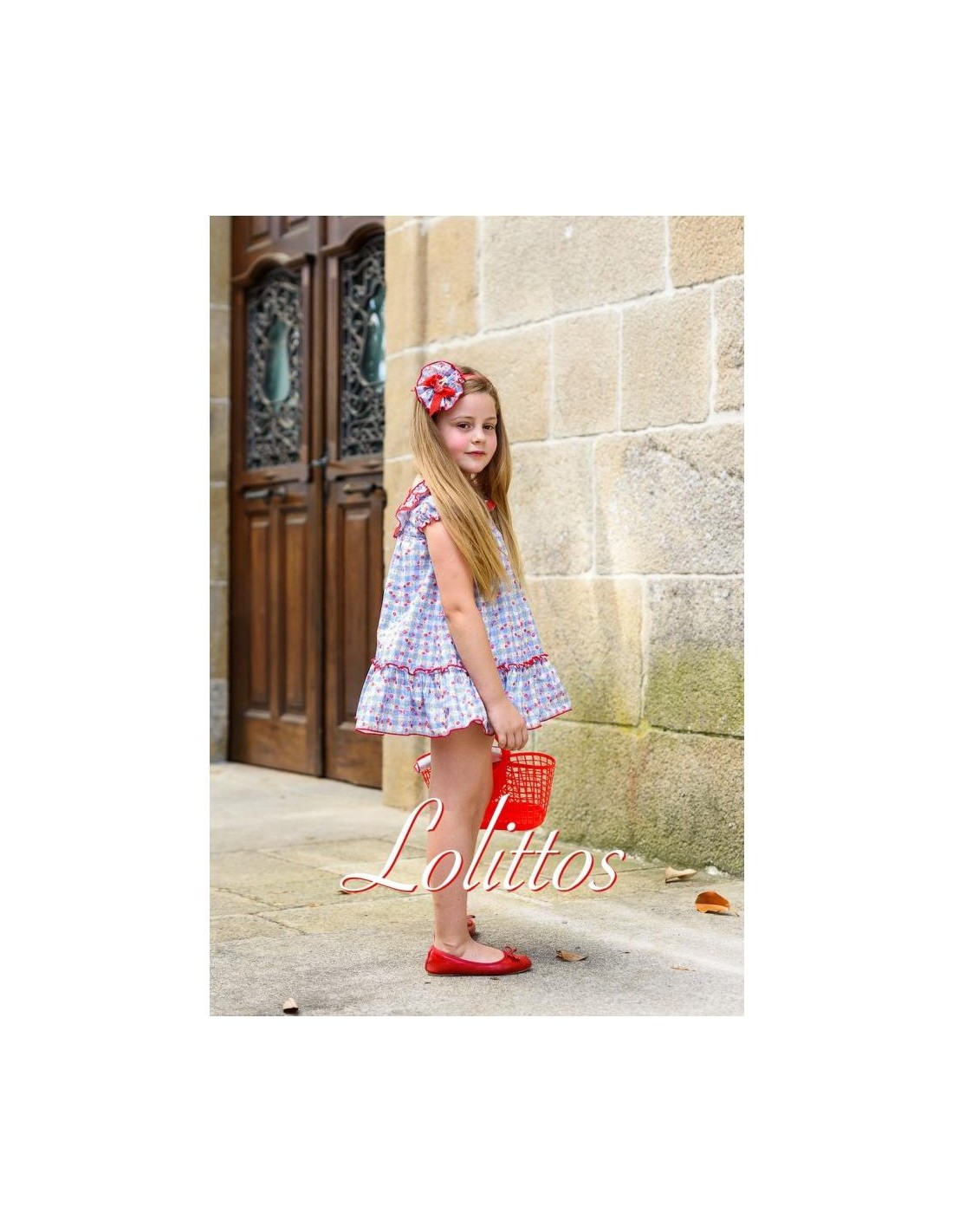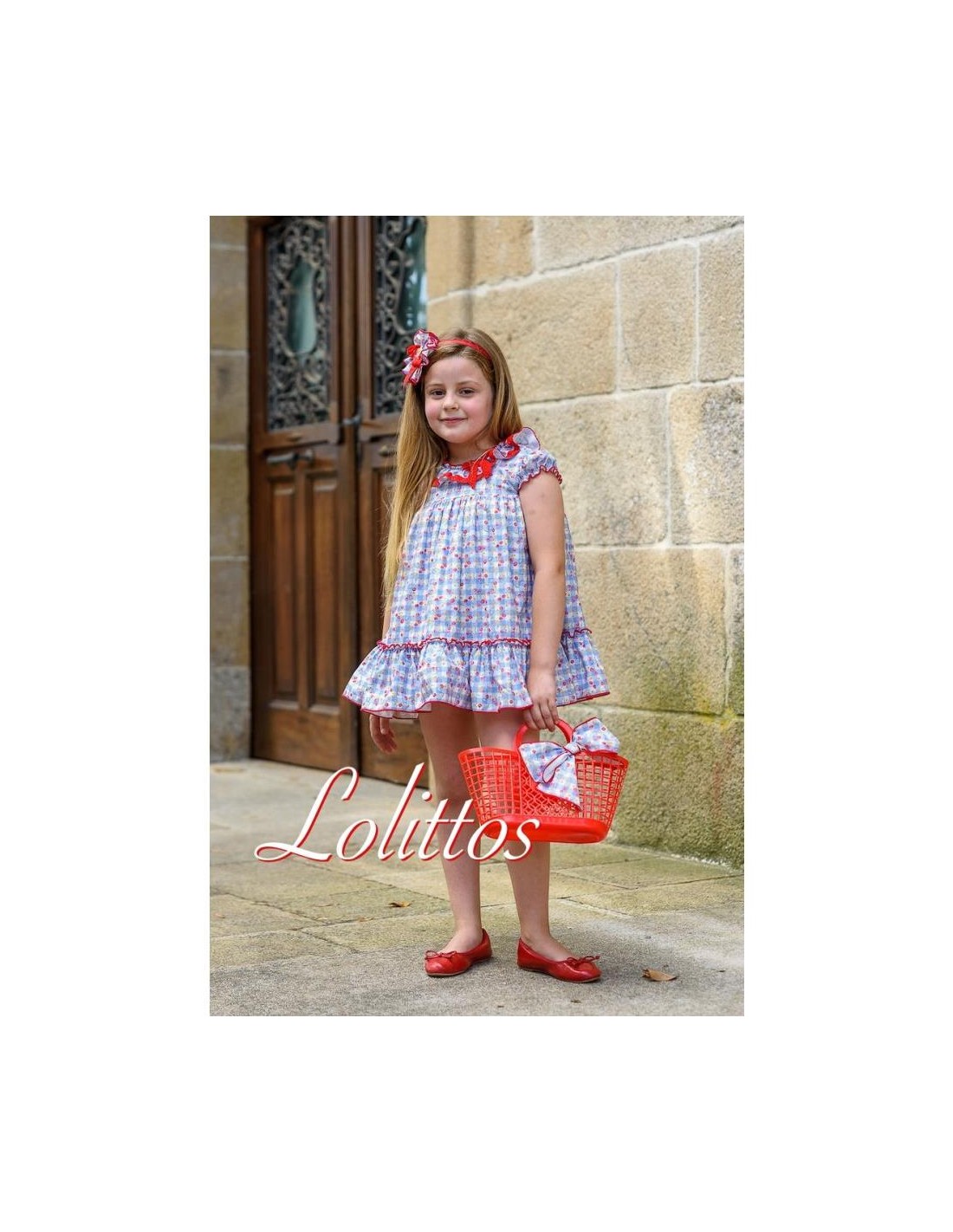 Vestido de manga corta con cuello volante, corte debajo de la pechera y volante en el bajo con abertura trasera y confeccionado en un original tejido estampado de vichy y cerezas.
