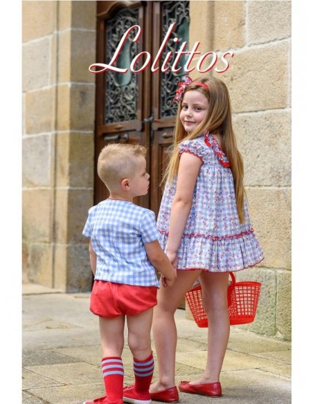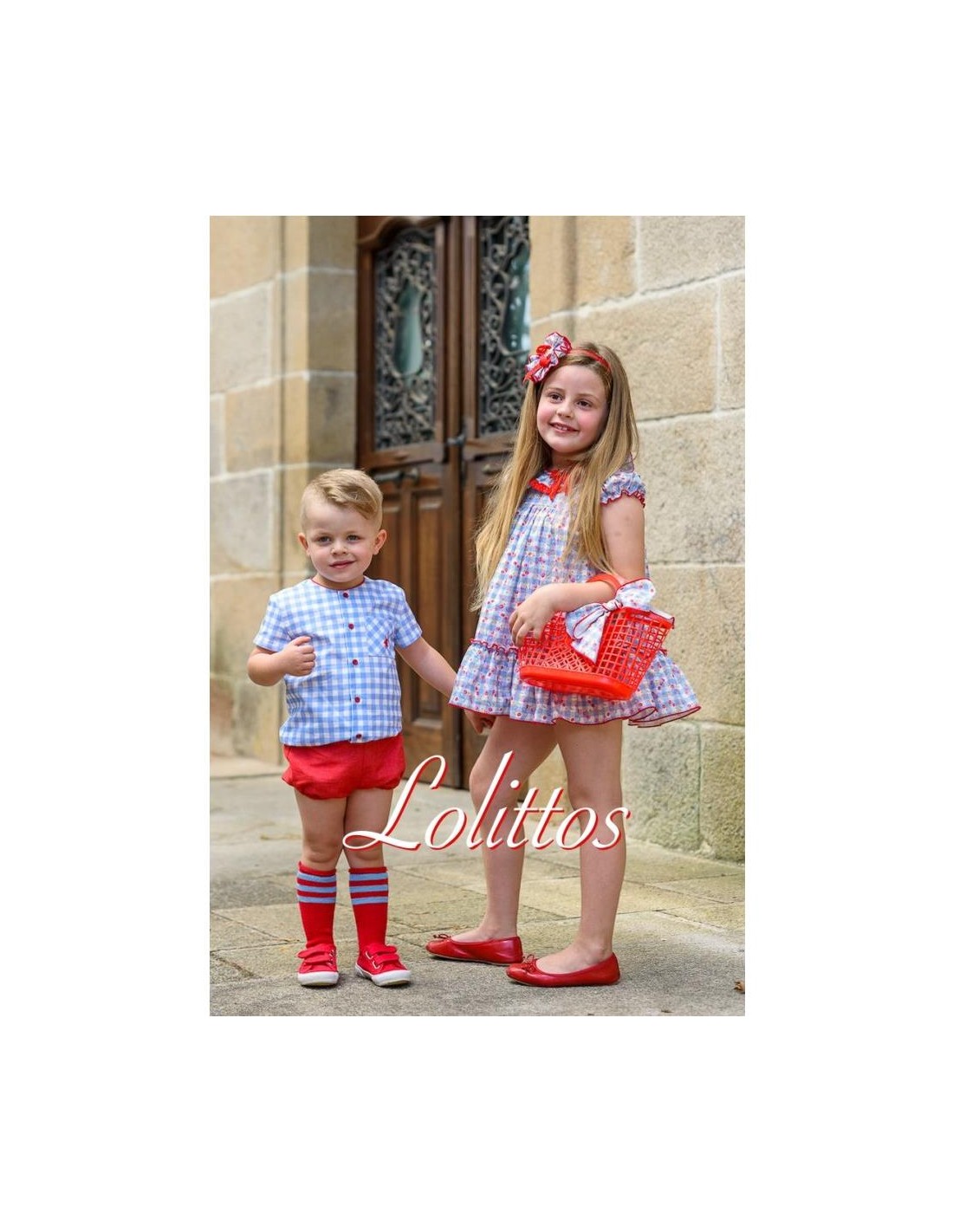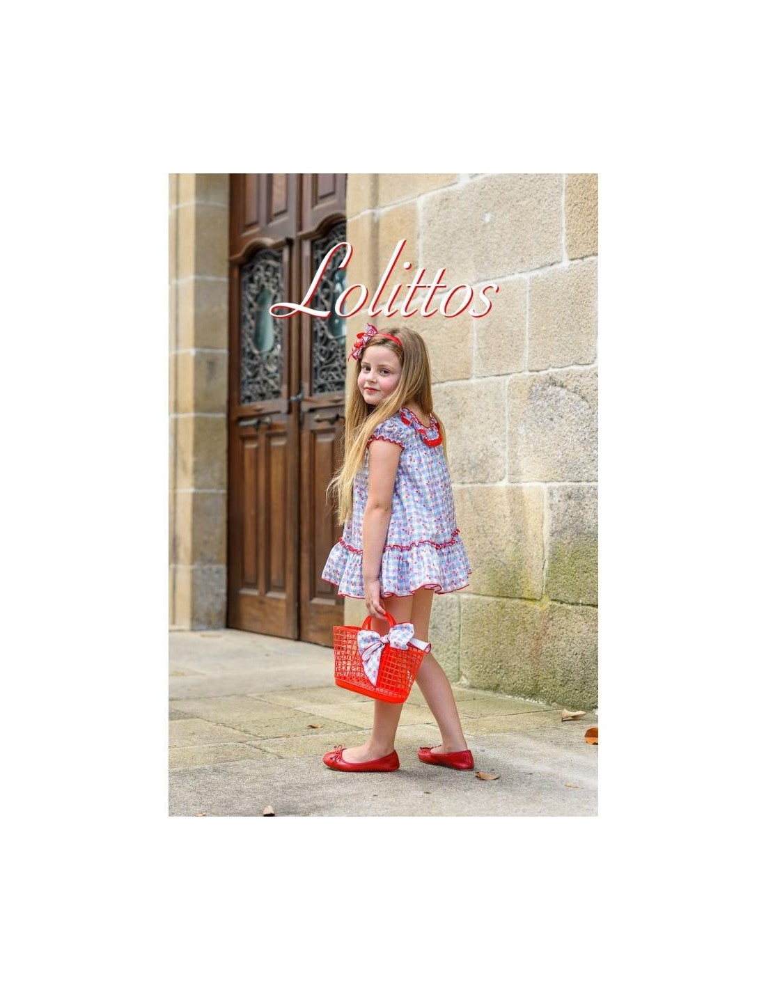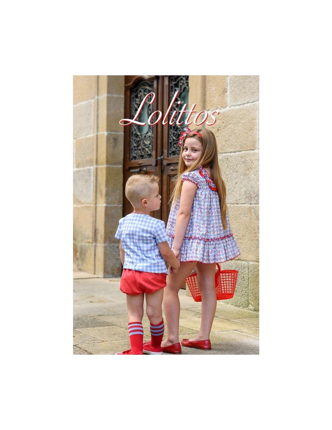 Vestido de manga corta con cuello volante, corte debajo de la pechera y volante en el bajo con abertura trasera y confeccionado en un original tejido estampado de vichy y cerezas.